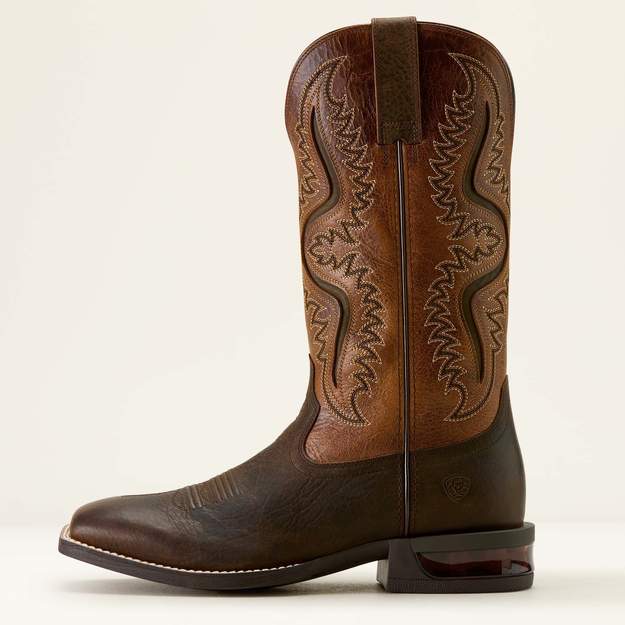 Turn heads with the bold look and superior comfort of the Ariat Men’s Captivate Boots in Dark Brown and Peanut Butter. Built for the modern cowboy, these premium full-grain leather boots showcase a striking two-tone design—a rich dark brown foot paired with a contrasting peanut butter-colored shaft detailed with classic Western stitching.