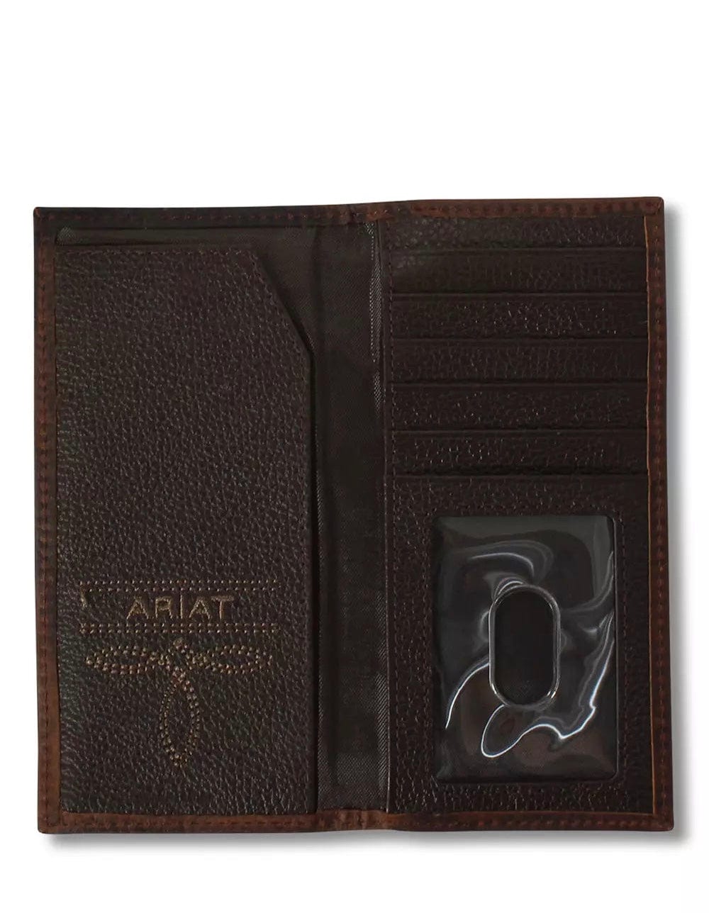 Give your young cowboy a wallet just like dad’s with this Ariat Boys’ Rodeo Wallet by M&F Western Products®. Crafted from genuine medium brown leather, this wallet features a classic boot stitch design on the front along with an Ariat concho for authentic western style. Built in a rodeo-style layout, it offers multiple slots and compartments to keep cards, cash, and essentials organized while fitting comfortably in a pocket.