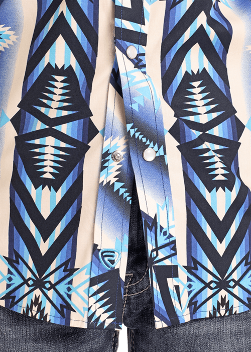 Experience comfort and style with the Rock & Roll Boy's Woven Blue Aztec Print Long Sleeve Snap Shirt. Featuring an eye-catching Aztec print, this shirt is made with high-quality fabric for all-day wear. With snap closures and long sleeves, it is perfect for any occasion. Upgrade your wardrobe with this fashionable shirt.