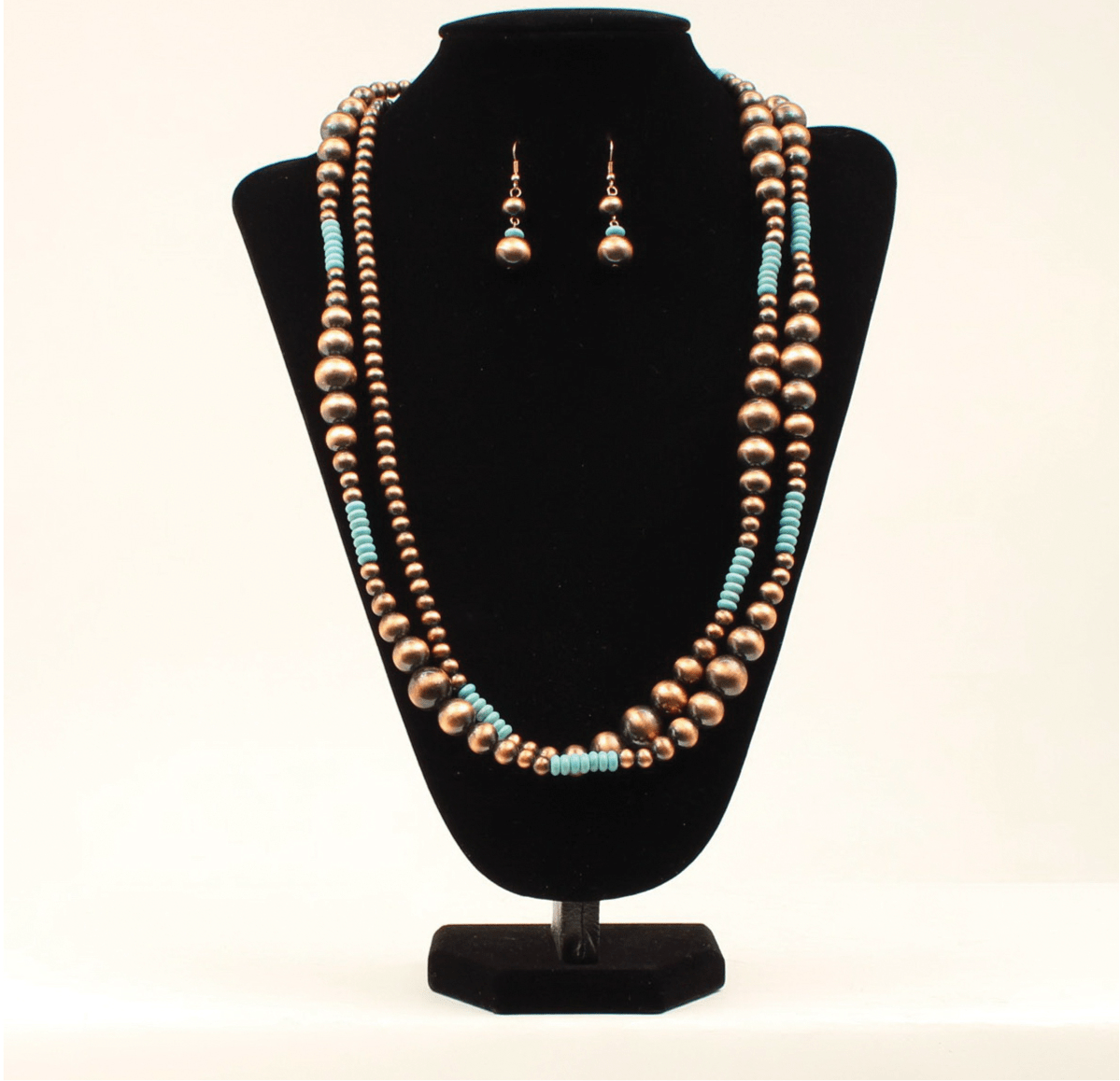 Instantly update your wardrobe with this Blazin Roxx necklace set by M&F Western Products. The necklace has a trendy look with copper Navajo pearls and turquoise beads. Can be worn as a long strand, or double it for a shorter look. It also has matching drop earrings to complete this great look. You will want to wear this beautiful set every day.