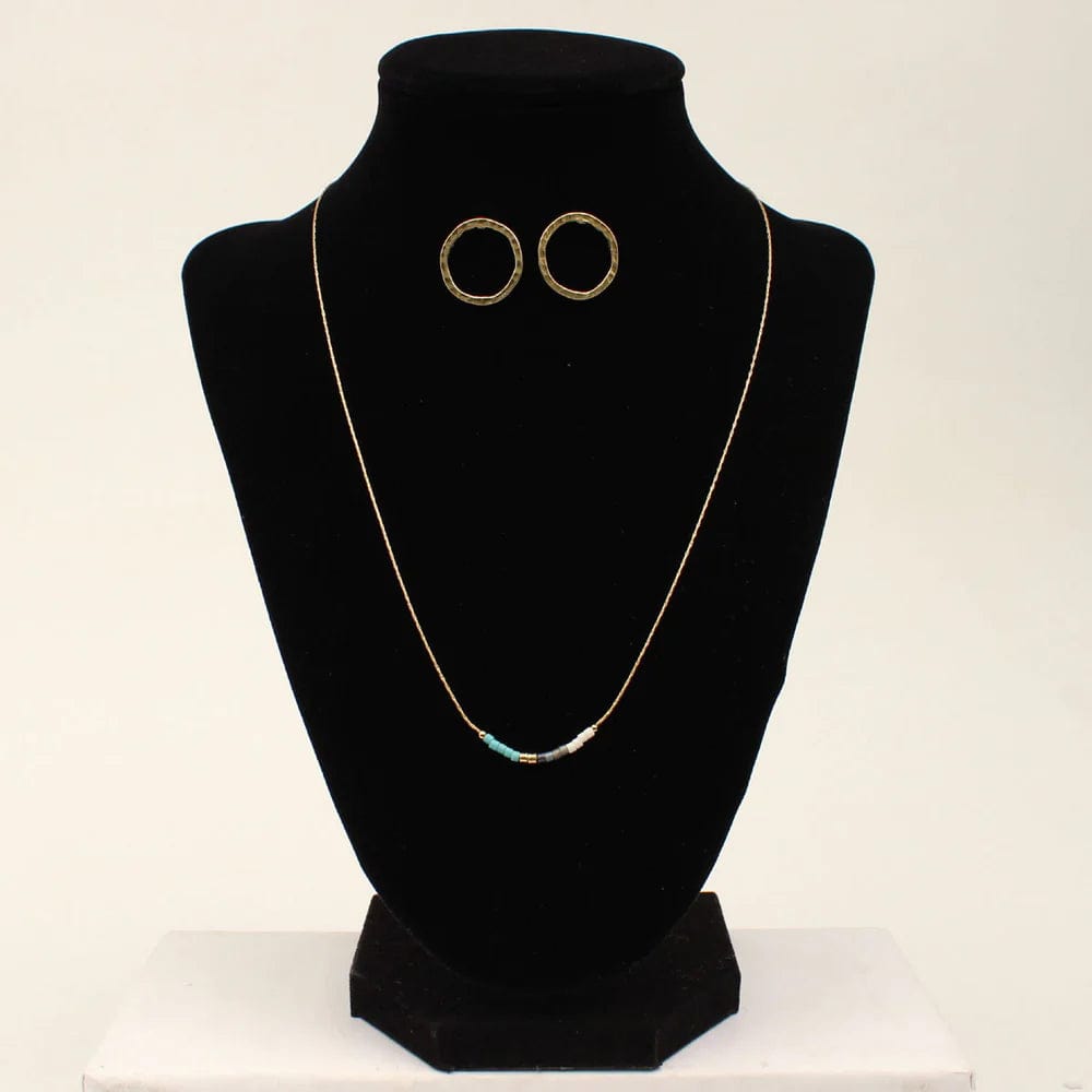 Simple, minimalist style Blazin Roxx necklace with a thin burnished gold chain with small multi colored beads. The earrings are a thin circle studs.