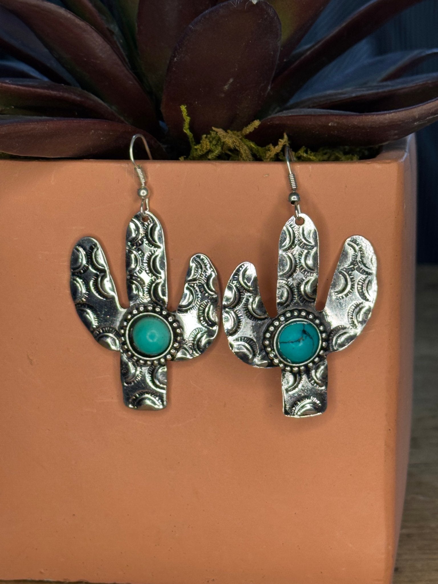 Add a touch of Southwestern flair to your jewelry collection with the Blazin Roxx Stamped Cactus with Turquoise Stone Earrings. These stunning earrings feature a unique stamped design, intricately detailed. Each Cactus earring is accented with a vibrant turquoise stone, adding a pop of color that perfectly complements the earthy tones of the metal. Whether you're dressing up for a night out or adding a rustic touch to your everyday look, these earrings are sure to make a statement. Crafted with care and designed to capture the spirit of the West, the Blazin Roxx Cactus Earrings are the perfect blend of style and southwestern charm.