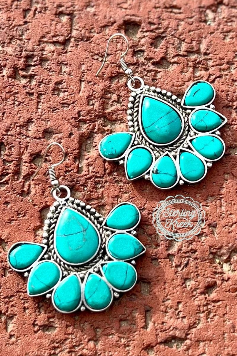 These FANCY FLARE earrings will add a bit of zing to any outfit. With 8 turquoise stones in a dangle design, you'll be sure to turn heads and your outfit from blah to BAM!