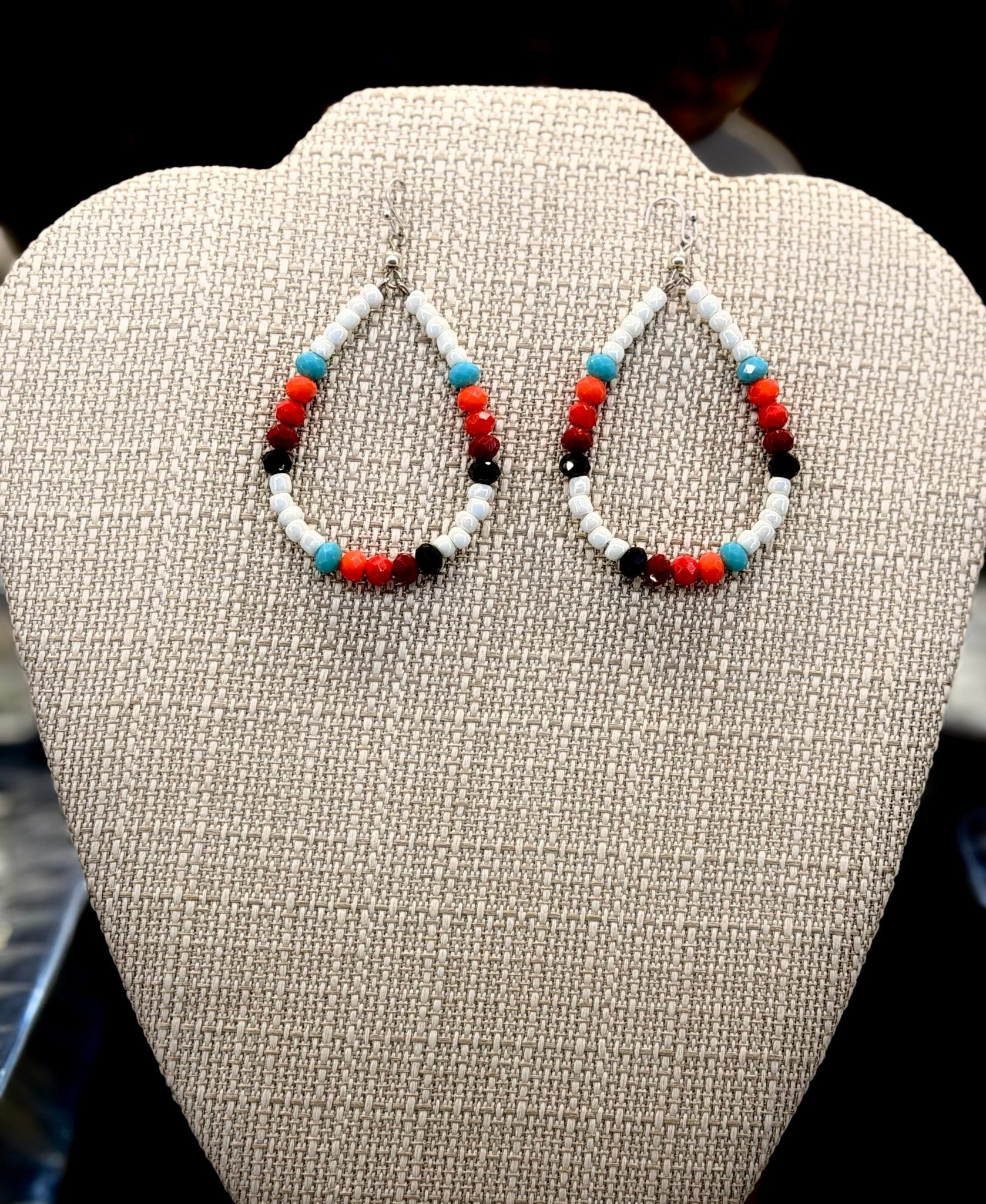 Add a pop of Western-inspired color to any outfit with these Silver Strike Ladies Teardrop Beaded Multicolor Earrings. Designed in a classic teardrop shape, these lightweight earrings feature a vibrant mix of white, turquoise, red, black, and deep maroon beads, creating a bold Southwestern style that pairs perfectly with everyday denim or your favorite dressy outfit.