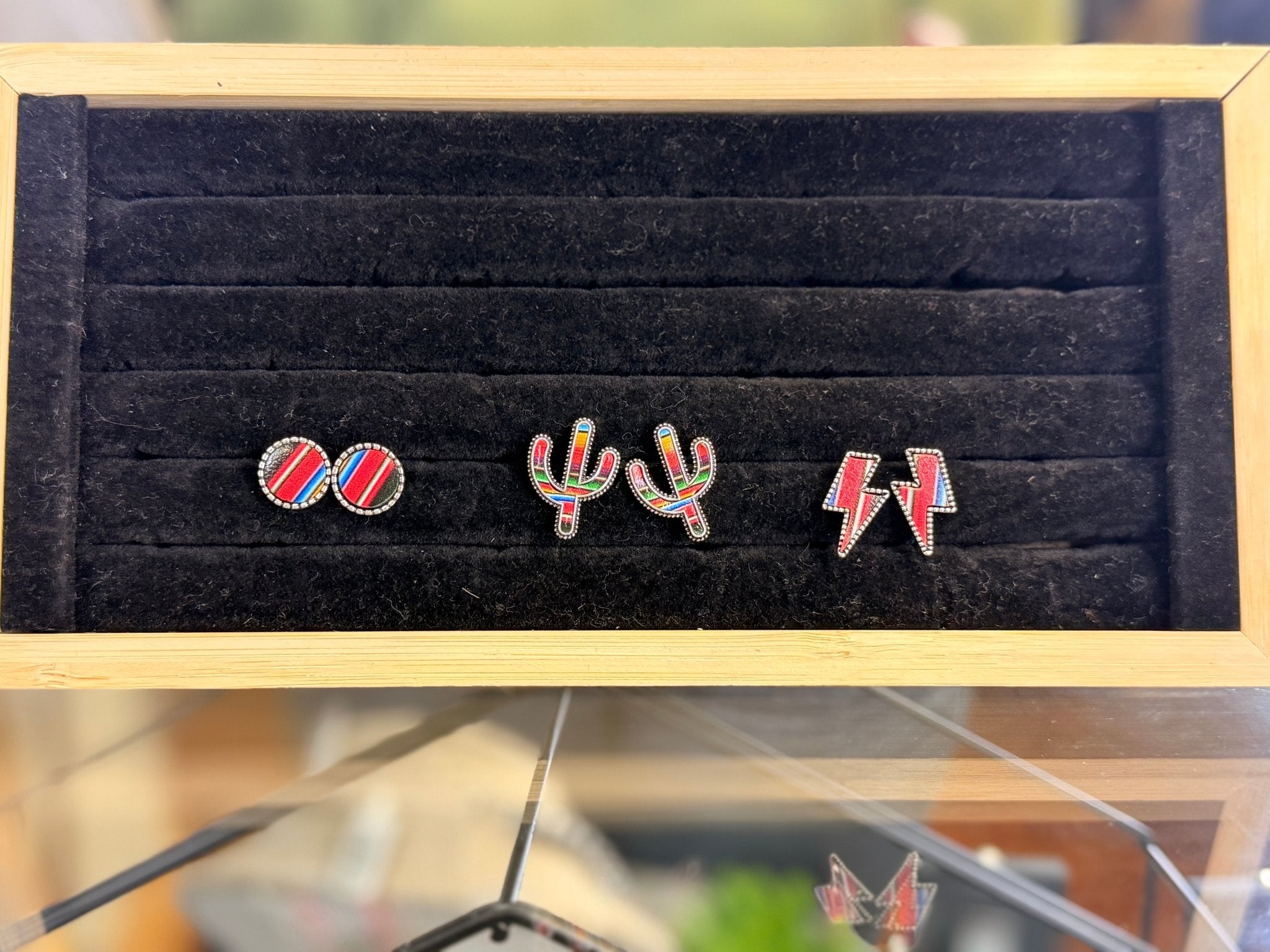 Add bold western flair to your everyday look with this Silver Strike Women’s Serape Stud Earrings Set, featuring three unique pairs inspired by Southwestern style. This coordinated set includes serape stripe round studs, colorful cactus studs, and serape lightning bolt studs, giving you versatile options to match your mood, outfit, or occasion.