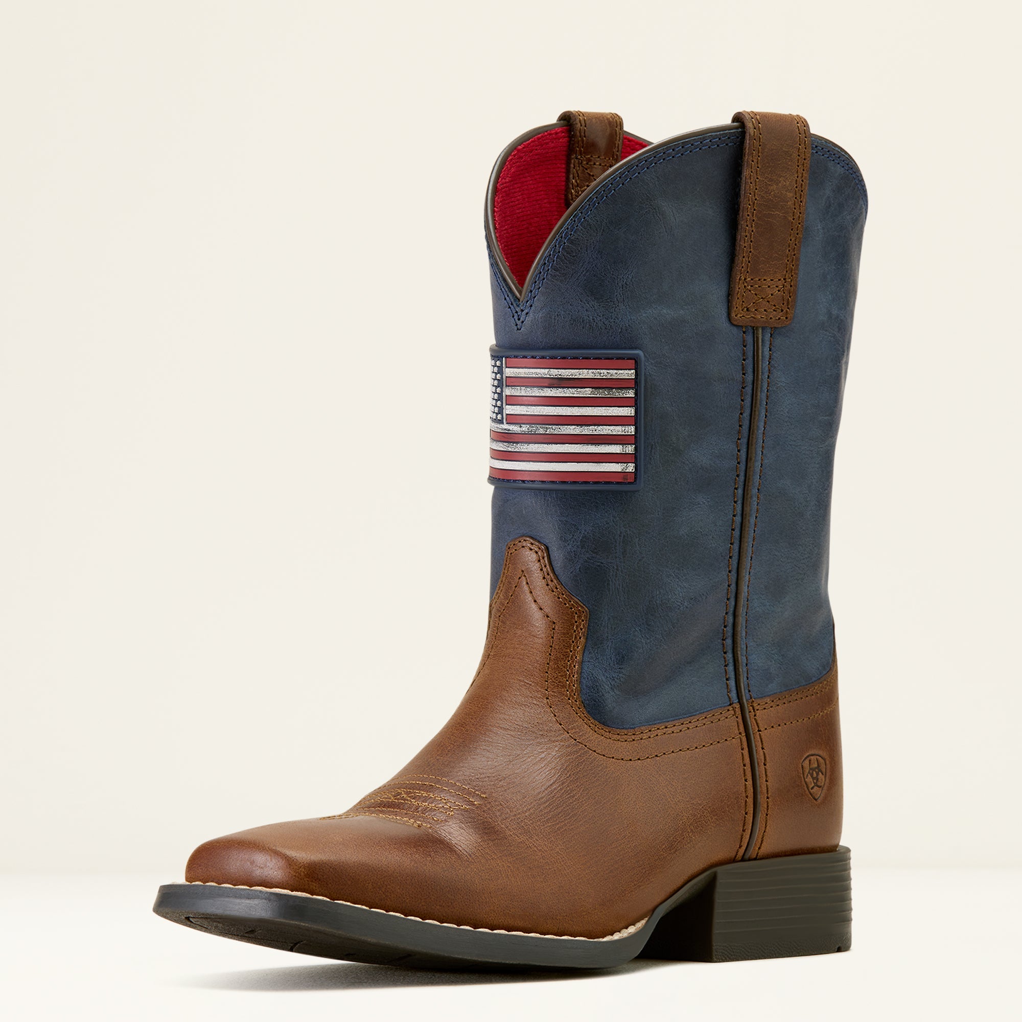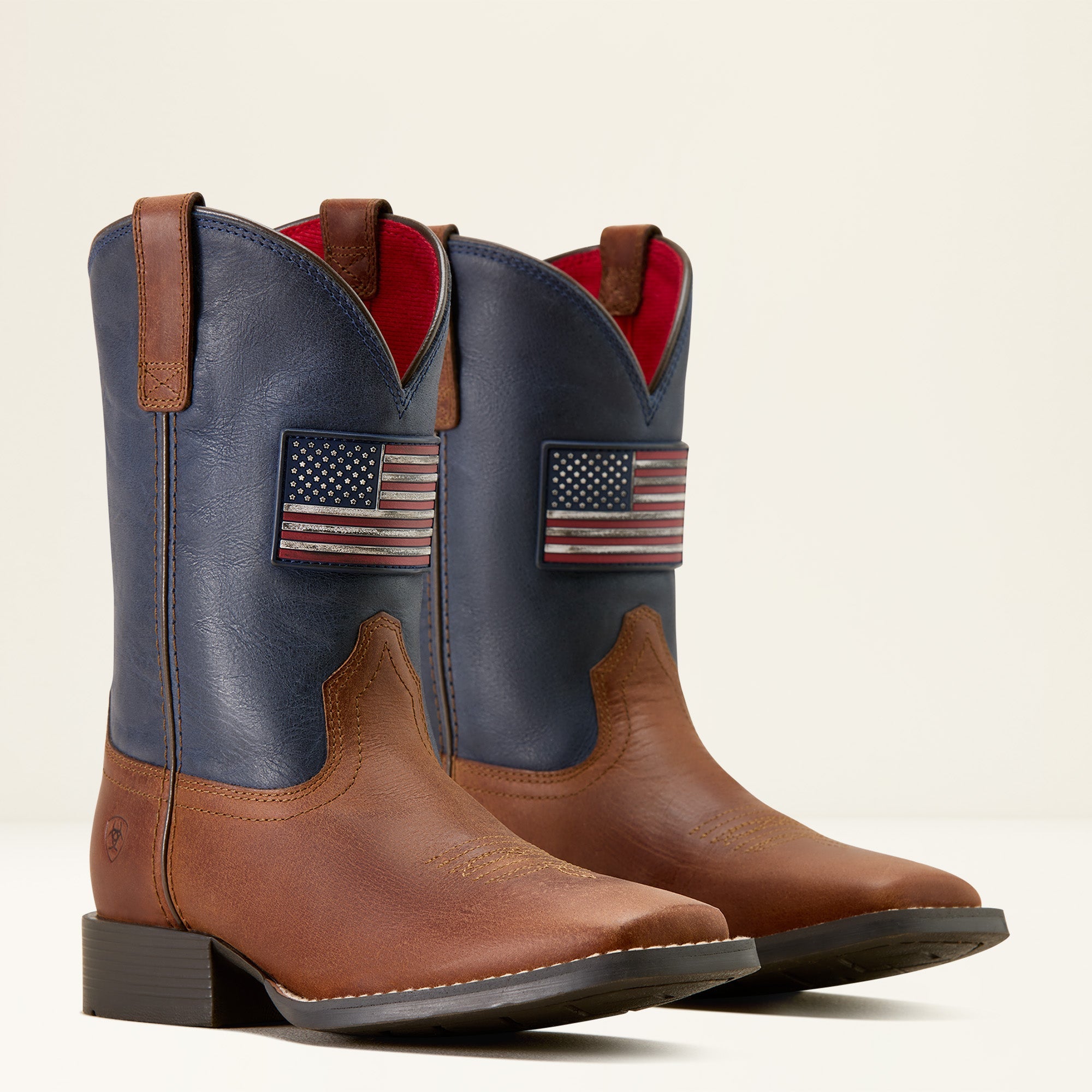The Ariat Youth Freedom Rider Square Toe Boots bring together classic Western durability with bold American pride. Featuring a rich brown leather foot paired with a deep navy shaft, these boots stand out with a stitched American flag patch that makes a strong statement in and out of the arena.