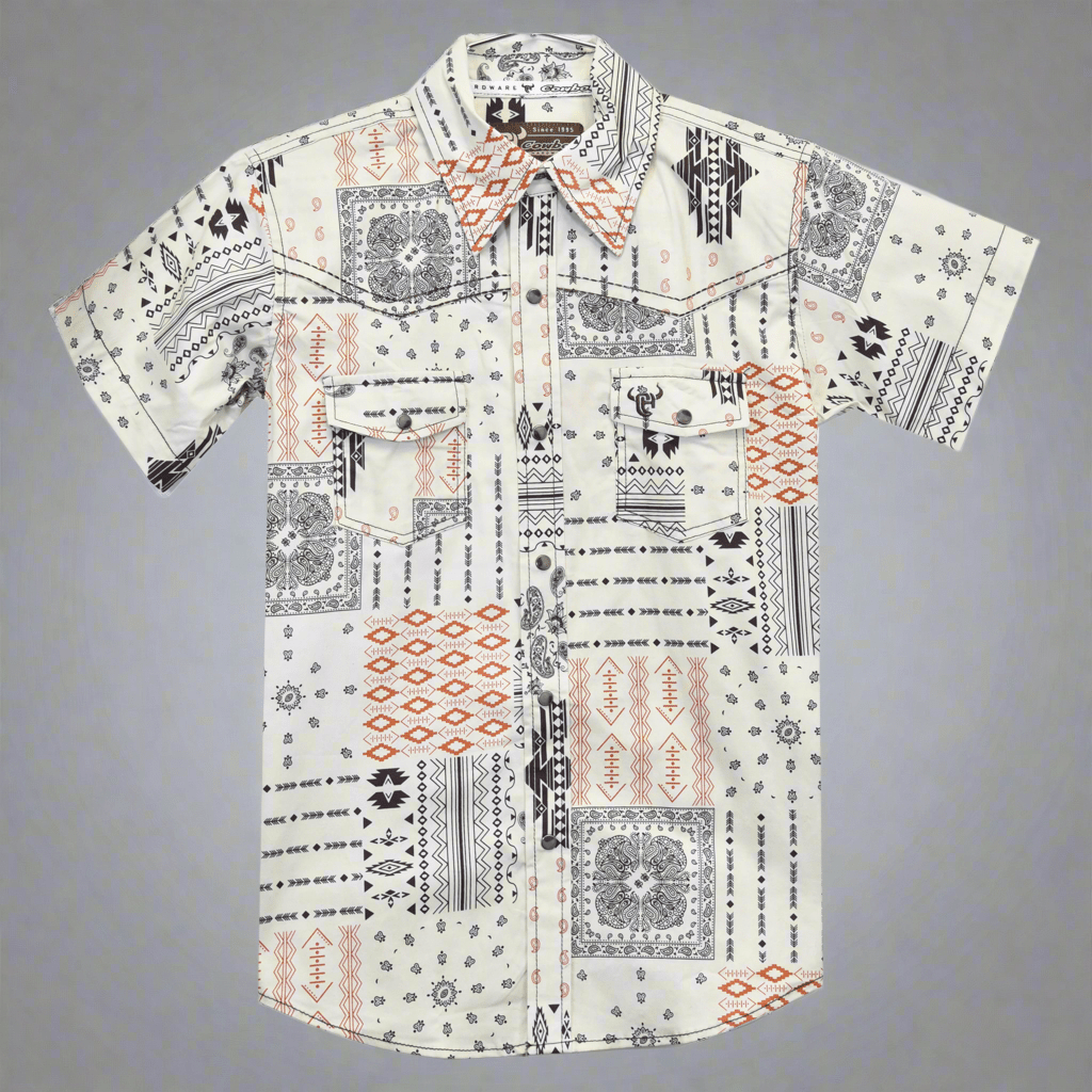 Saddle up in style with the Cowboy Hardware Youth Boys Aztec Bandana Short Sleeve Shirt — where Western tradition meets modern flair. Designed for the young cowboy with a bold spirit, this shirt features a vibrant Aztec bandana print that adds a rugged, adventurous edge to any outfit.