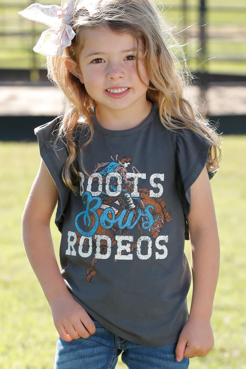 Kids Cruel Girls Boots Bows Rodeos Ruffle Tee features a cute vintage rodeo themed print and fun details. Girls' sleeveless T-shirt has dramatic ruffles at the armholes to take the place of short sleeves. The Cruel Girls top is cool and lightweight for summer in a cotton/poly blend.
