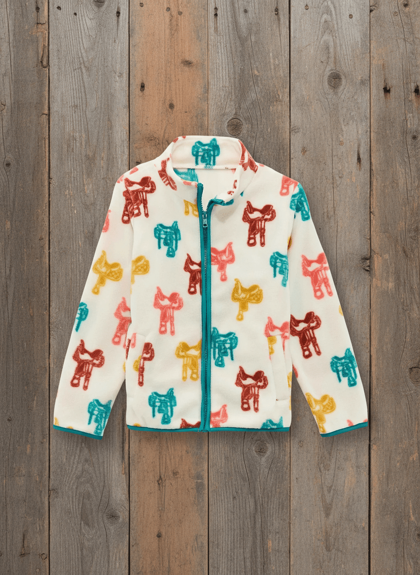 Keep her cozy and cute in this Youth Girls Western Fleece Zip Jacket. Crafted from soft, lightweight fleece, it’s the perfect layer for cool mornings, school days, or the barn. The playful multicolor saddle print adds a fun pop of Western charm, while the full-zip front makes layering easy and comfortable.