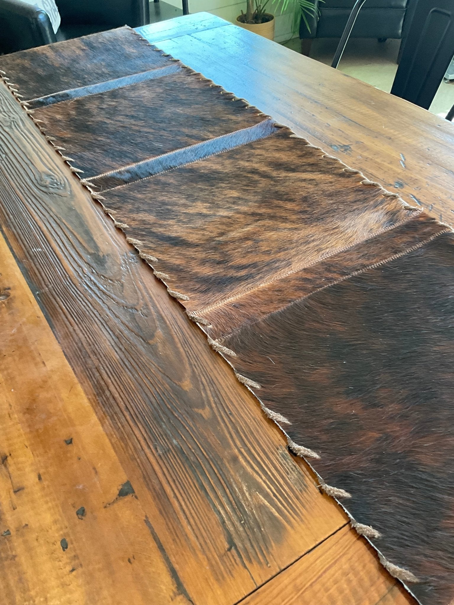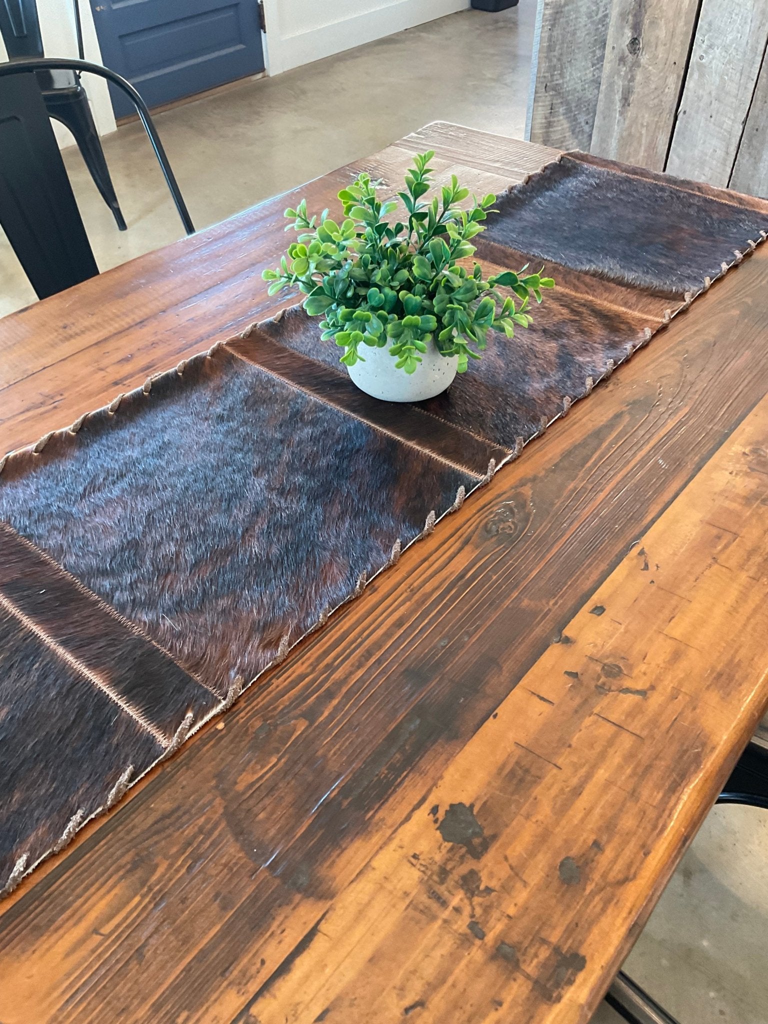 Perfect as a dining table centerpiece, buffet accent, or statement piece for a rustic lodge or ranch house, this runner brings together the natural beauty of cowhide with timeless craftsmanship. A truly classy addition to farmhouse or western-inspired décor.