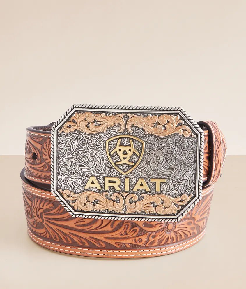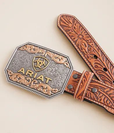 Add a refined western touch to your look with the Ariat Men’s Floral Embossed Taper Belt, featuring a premium leather strap and an intricately designed buckle. The belt showcases a classic floral embossed pattern, tapered ends for a sleek fit, and a removable silver-tone buckle accented with gold and rose gold detailing for a standout finish. Built for both style and durability, this belt transitions seamlessly from work to weekend.