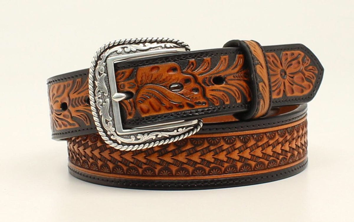 Upgrade your western style with this Ariat Men’s Belt by M&F Western Products. Crafted with a two-toned sturdy leather strap, this belt features a hand-stamped arrowhead basketweave design running down the center, perfectly framed by contrasting black leather edges. The floral embossed tabs add a touch of sophistication, while the detailed silver buckle with a rope edge completes the classic western look. The removable buckle and single two-toned embossed leather keeper make this belt both stylish and practical—perfect for work, casual wear, or dressing up.