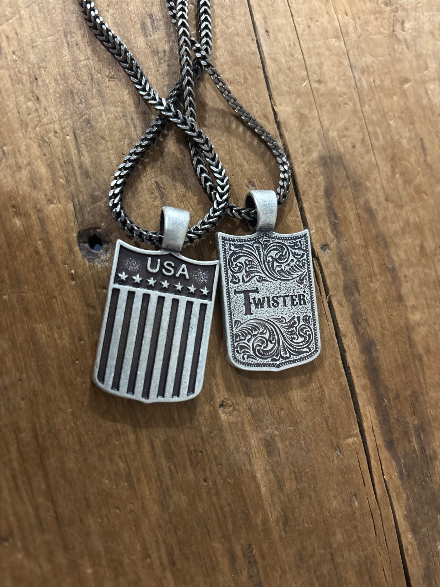 Show your patriotic pride with this bold Twister Men’s Necklace by M&F Western Products. Featuring an intricately detailed eagle head and shield pendant with red, white, and blue enamel accents, this necklace embodies strength and American spirit. The pendant hangs from a durable 24-inch stainless steel rope chain with a secure lobster clasp closure for all-day wear.