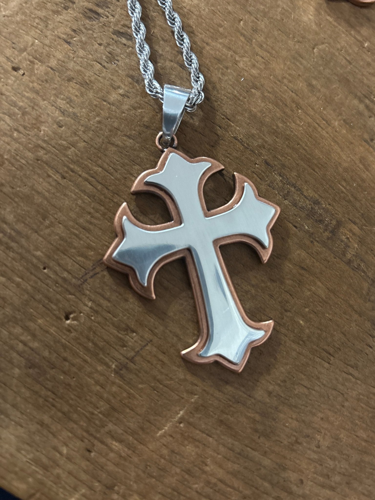 Add rugged Western style and meaning to your look with this Twister Men’s Necklace by M&F Western Products. The pendant features a bold layered cross design with rich two-tone metal finishes—antique silver and copper—for a dimensional, rustic look. Hanging from a 24-inch chain, this piece offers the perfect balance of faith and fashion.