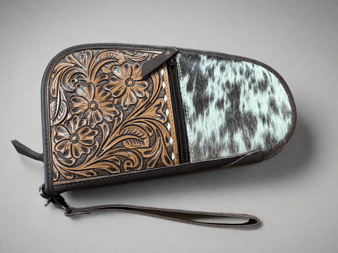 Each case is one-of-a-kind, with natural cowhide patterns and classic Western tooling that make it as unique as your firearm. The soft, padded interior offers secure protection, while the durable zipper closure keeps your pistol safely stored during transport or at home.