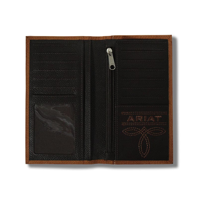 Keep your essentials organized in classic western style with this Ariat Rodeo Wallet by M&F Western Products®. Made from genuine medium brown leather, this wallet is detailed with contrast double stitching and finished with the embossed Ariat logo and shield at the top. Inside, it offers plenty of storage with multiple card slots, a full cash compartment, a removable photo slip, and a clear ID window.
