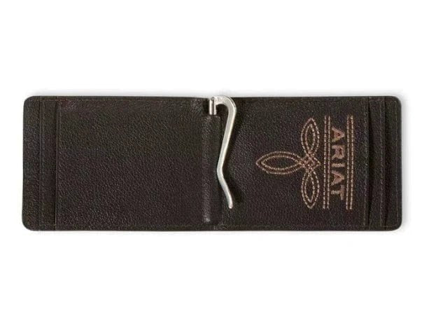 Keep your cash and cards secure with rugged western style in this Ariat Money Clip Wallet by M&F Western Products®. Crafted from genuine tan roughout leather, this wallet is accented with a chocolate rowdy leather overlay, detailed buck lace stitching, and an embroidered Ariat logo and name on the front. The bi-fold money clip style offers a slim, practical design with card slots and an ID window inside, plus a durable spring money clip on the outside for quick cash access.