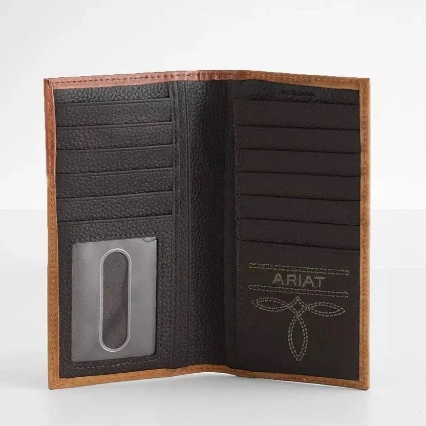 Make a bold western statement with this Ariat Rodeo Wallet by M&F Western Products®. Crafted from genuine medium brown leather, this wallet features a scalloped scroll embossed overlay with a pierced ivory edge diamond cutout, accented by a silver diamond-shaped concho for a touch of western sophistication. The spacious rodeo-style interior includes multiple card slots, a cash compartment, a removable photo slip, and a clear ID window, giving you the perfect mix of style and functionality.