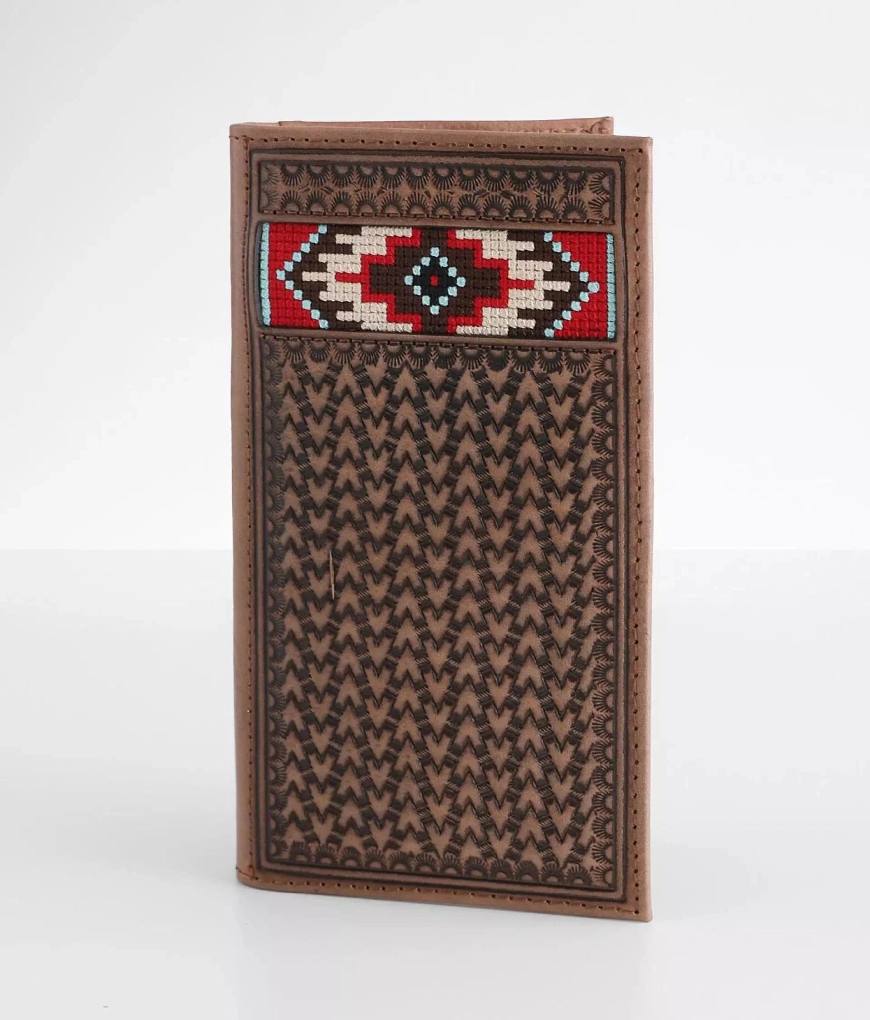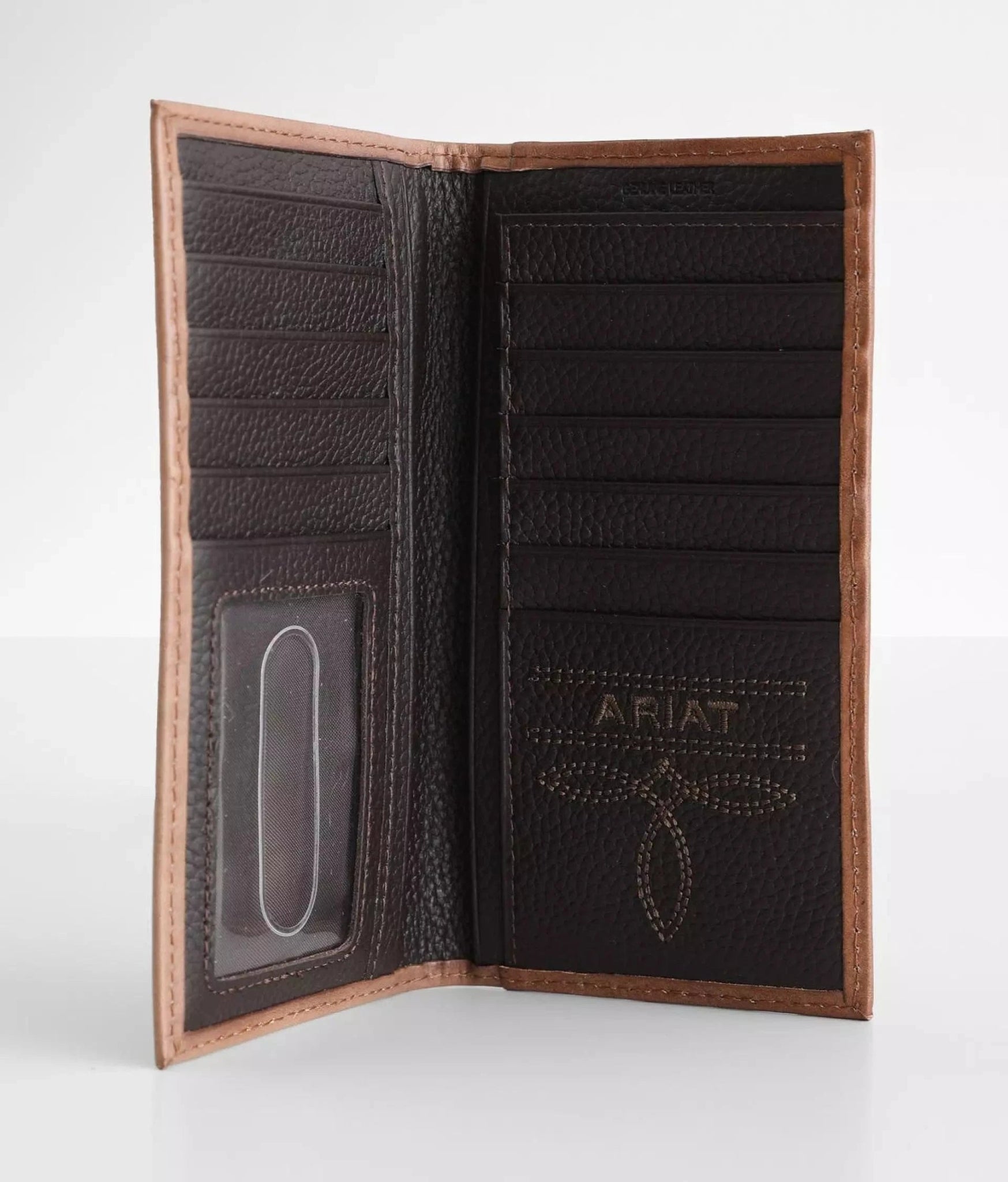 Capture the spirit of the West with this Ariat Rodeo Wallet by M&F Western Products®. Crafted from genuine leather, this beautifully detailed wallet features intricate basketweave embossing accented with vibrant western embroidery for a look that stands out. Built for both style and function, the rodeo checkbook-style layout offers plenty of room with multiple card slots, a cash compartment, a checkbook holder, and an ID window—keeping everything organized while adding authentic cowboy character.