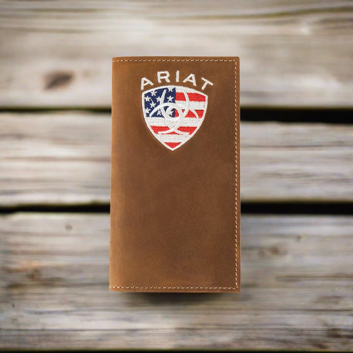 Celebrate your western pride and patriotism with this Ariat Rodeo Wallet by M&F Western Products®. Crafted from genuine aged bark bull hide leather, this wallet is built for durability while offering a slim fit design that easily slips into your pocket. The front features bold American flag embroidery with the Ariat name in white, highlighted by heavy-duty stitching for long-lasting strength. Inside, the wallet is designed with multiple card slots and compartments to keep your essentials secure and organized.