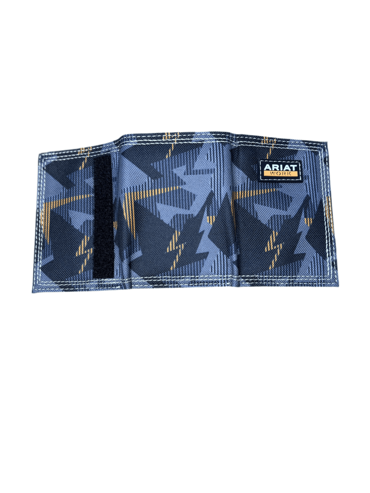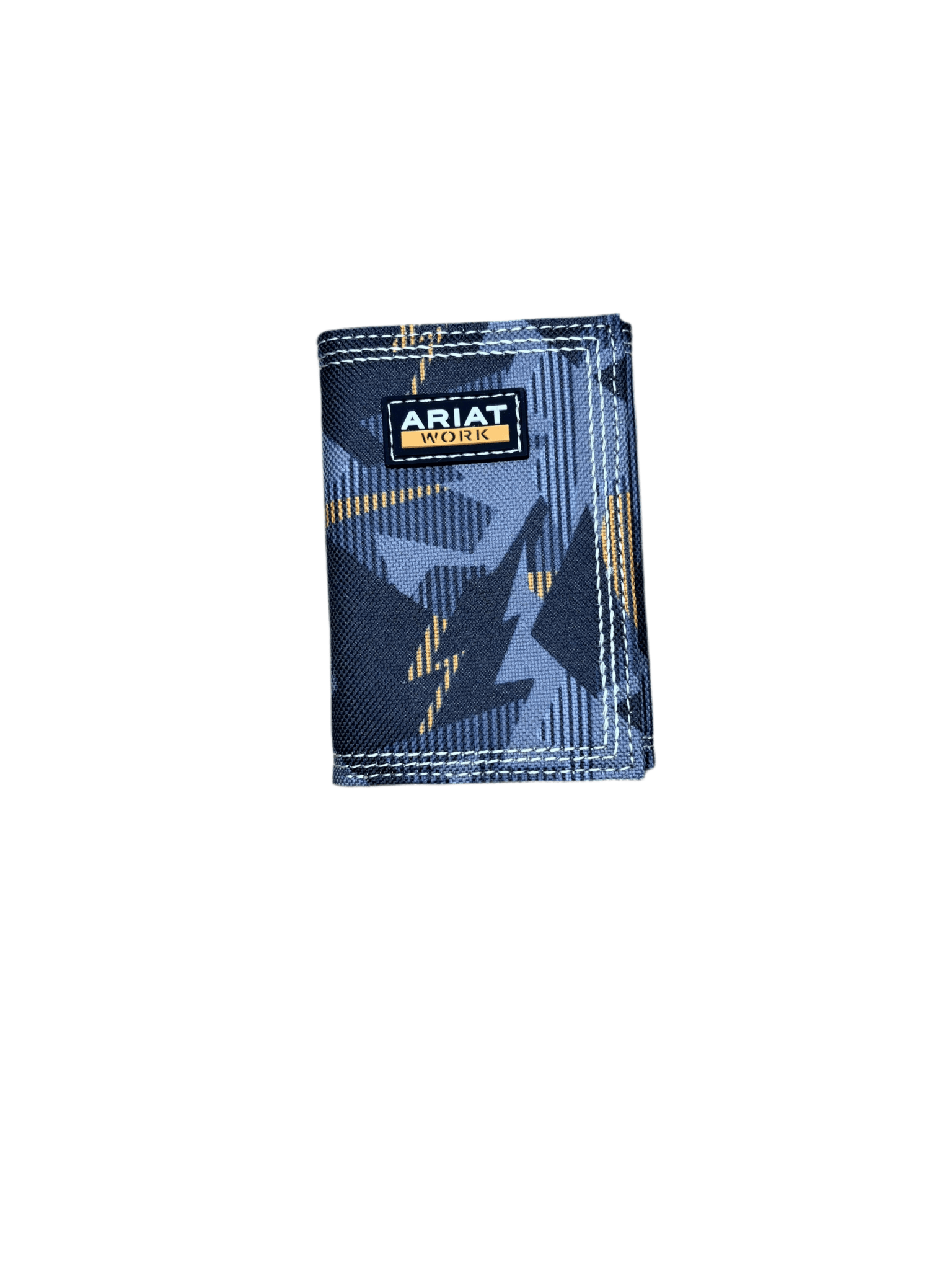 Stay secure and organized with the Ariat Work Tri-Fold Wallet by M&F Western Products®. Built tough for the hardworking cowboy, this wallet is crafted with an eco-friendly design, featuring a 100% recycled polyester exterior and a durable Rebar orange recycled mesh interior. Equipped with RFID blocking technology, it helps protect your cards from electronic theft. The interior offers multiple card slots, a cash pocket, and a clear PVC easy-release ID window, while the Velcro closure ensures everything stays secure. A bold Ariat graphic print adds the perfect finishing touch.