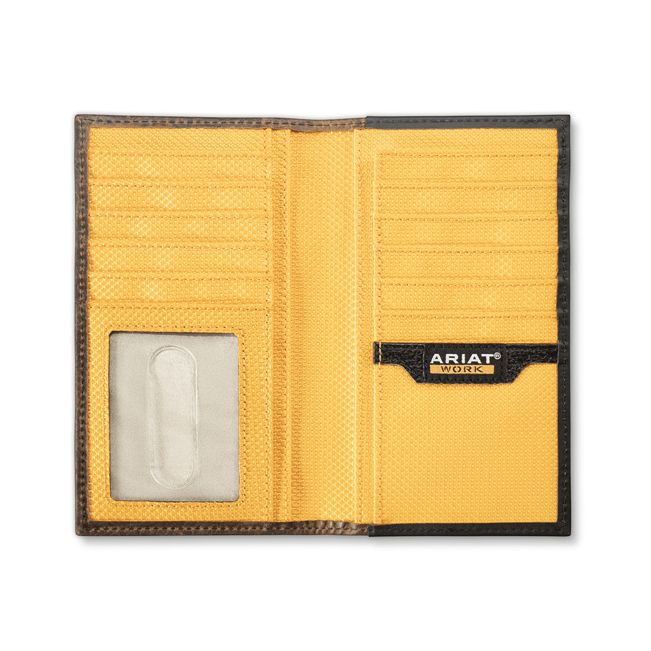 Tough, functional, and secure—the Ariat Work Checkbook Wallet by M&F Western Products® is built for the hardworking cowboy. Made with a 100% genuine top grain leather exterior, this wallet is reinforced with RFID blocking technology to keep your cards protected from electronic theft. Inside, the Rebar orange recycled mesh lining adds durability and style, highlighted by a bold Workman VenTEK graphic cutout. The checkbook-style layout includes multiple card slots, cash compartments, a checkbook holder, and a clear PVC easy-release ID window for everyday convenience.