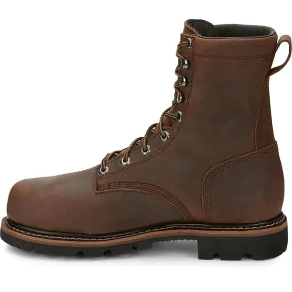 Built for the toughest jobs, the Justin Pulley Waterproof Work Boot offers the protection, comfort, and durability hardworking men depend on. Standing 8 inches tall, this boot is crafted from distressed brown waterproof Wyoming leather to keep your feet dry and comfortable no matter the conditions.