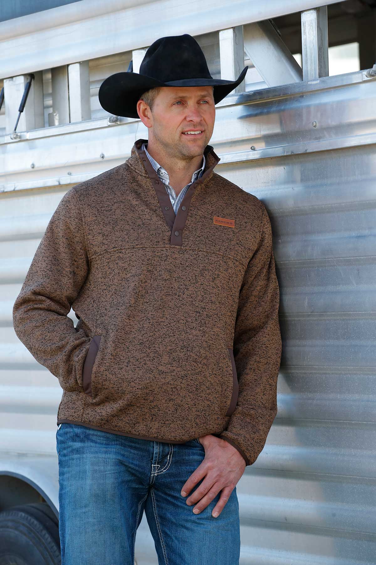 Crafted from soft, midweight fleece, it offers cozy comfort without bulk. The khaki body with contrast accents gives it a clean, versatile look that pairs perfectly with jeans or work pants. Featuring a quarter-snap front, stand-up collar, and signature Cinch logo, this pullover keeps you looking sharp whether you’re out on the ranch or in town.