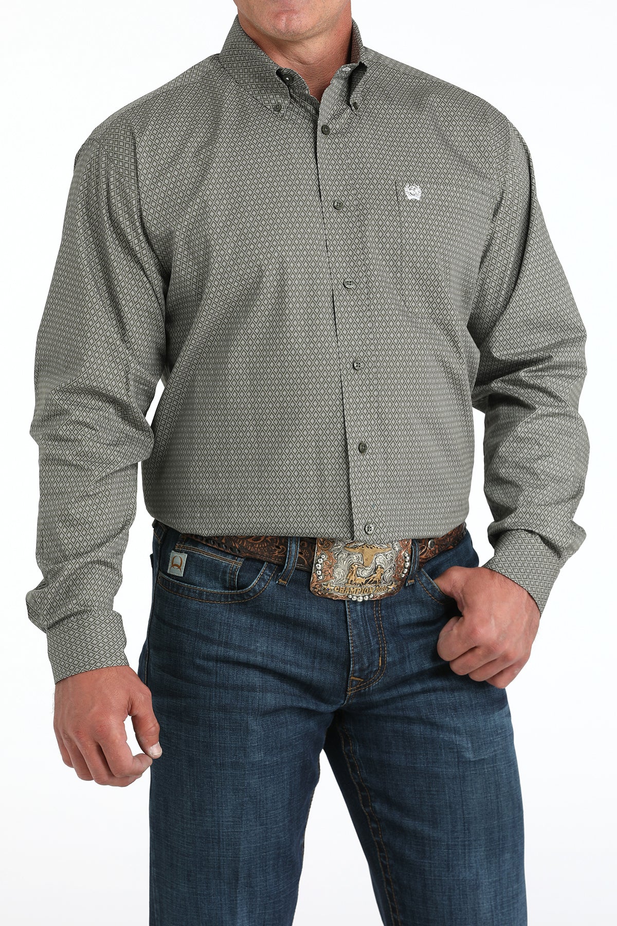 Show off clean, confident cowboy style in the Cinch Men’s Long Sleeve Button Down Shirt – MTW1105981. Featuring a refined diamond dot print on a rich olive green base, this shirt delivers subtle texture with modern western edge.