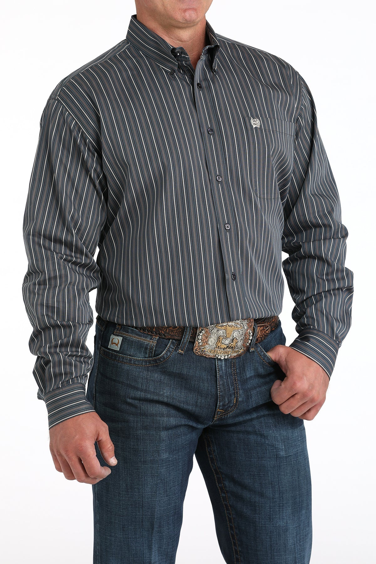 The Cinch Men’s Long Sleeve Western Stripe Shirt in charcoal and blue delivers a perfect balance of classic Western tradition and modern style. Designed for the hardworking cowboy, this shirt features a refined stripe pattern, button-down front, and single chest pocket with embroidered Cinch logo, giving it a sharp, polished look for any occasion.