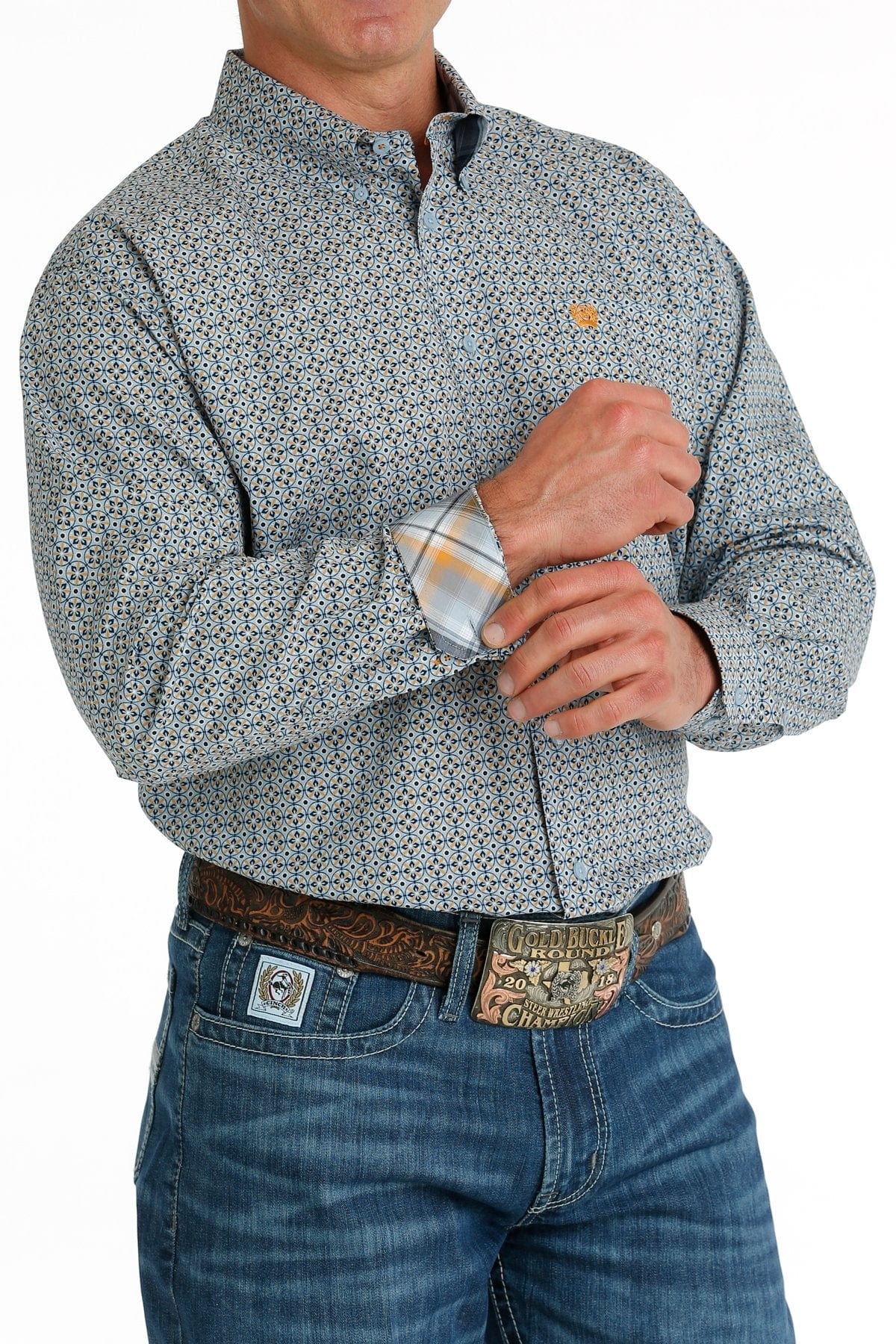 This head-turning light blue printed cotton plain weave with plaid contrast trim is a classic you'll want to keep in your weekly rotation. Designed with an open left front pocket, embroidered CINCH logo and blue buttons, it's guaranteed to up-style your favorite blue jeans.