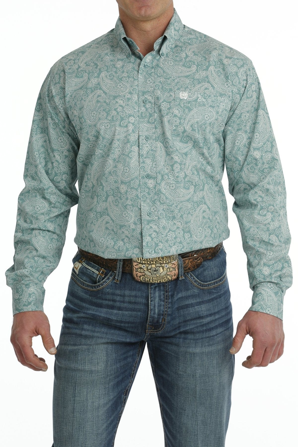 A timeless turquoise paisley print patterns this classic cotton plain weave to elevate any blue jeans or slacks in the stack. Design features include an open left front pocket with embroidered CINCH logo and blue buttons.