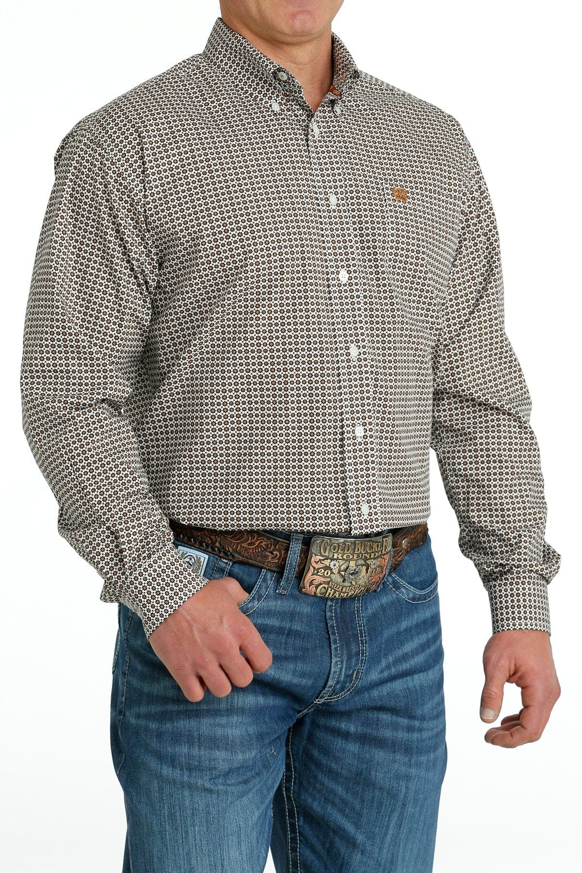 Bring out your talent for style wearing a white printed cotton plain weave crafted by CINCH. A perfect match for blue jeans or khakis, this handsome shirt features an open left front pocket with embroidered logo and white buttons.