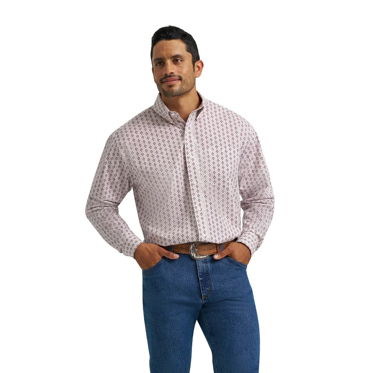 Elevate your western wardrobe with this Wrangler men’s classic fit shirt in a bold sangria print. Designed for comfort and timeless style, this long sleeve western shirt features a button-down collar, straight back yoke with box pleat, and a handy chest pocket. Crafted from a durable cotton-poly blend, it delivers the perfect balance of breathability, wrinkle resistance, and easy care.