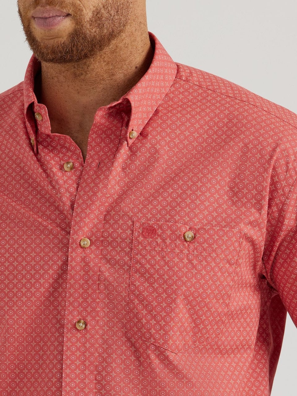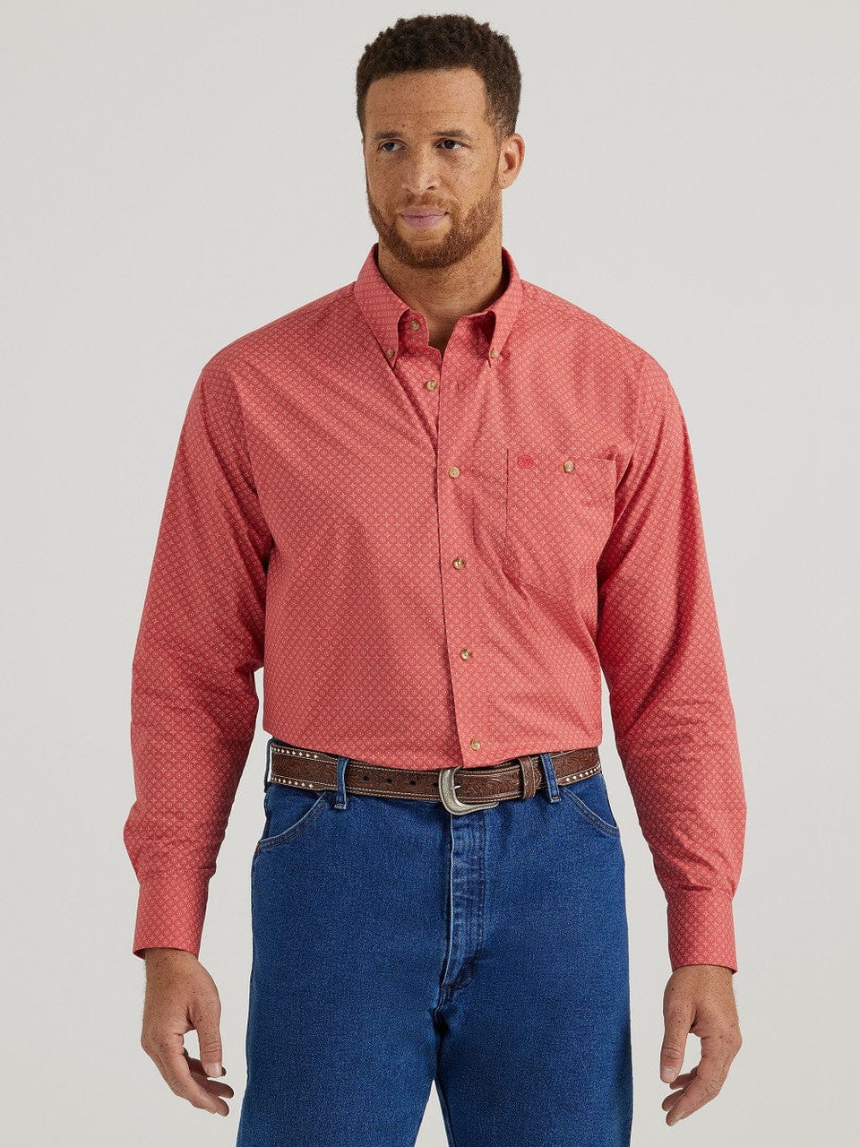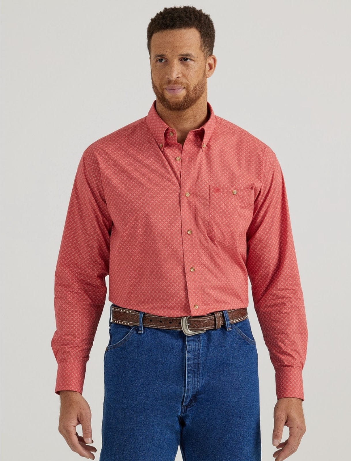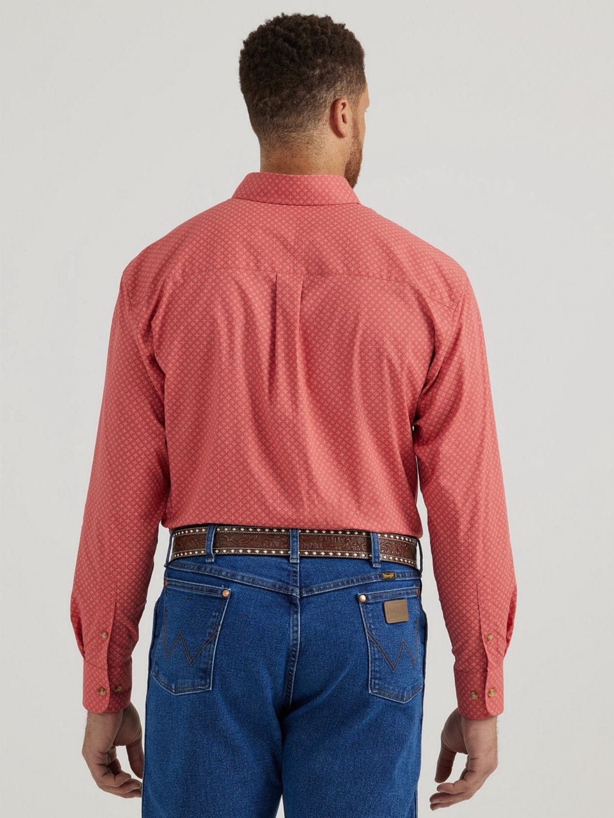 Long Sleeve, Button-down Collar, Straight Back Yoke with Box Pleat, One Button Through Pocket, Two Button Adjustable Cuff, Easy Care.