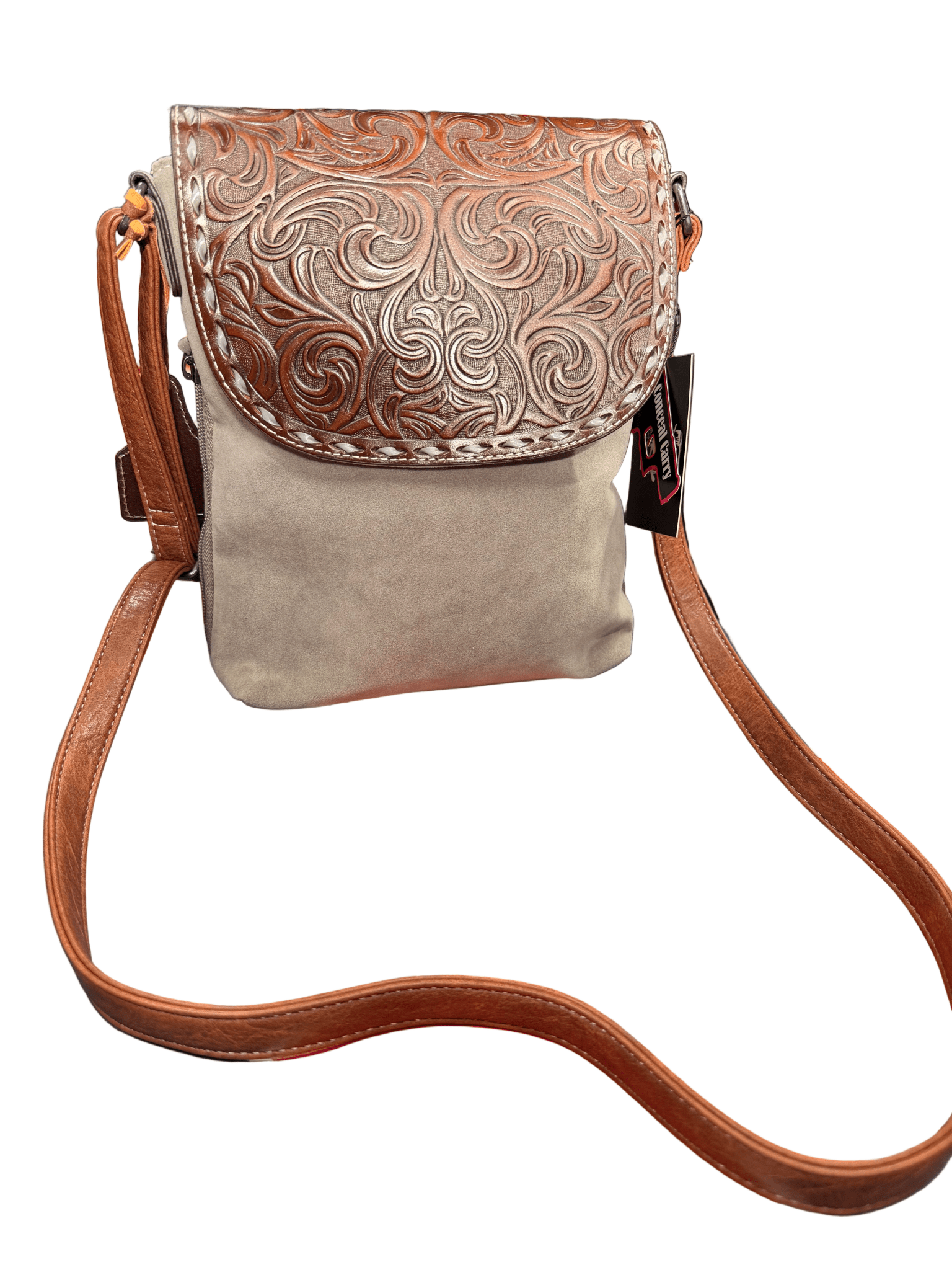 The Celia Crossbody features a spacious main compartment lined for durability, keeping your essentials organized and secure. With its neutral gray tone and simple yet refined Western aesthetic, this bag complements any outfit—from classic denim and boots to casual dresses.