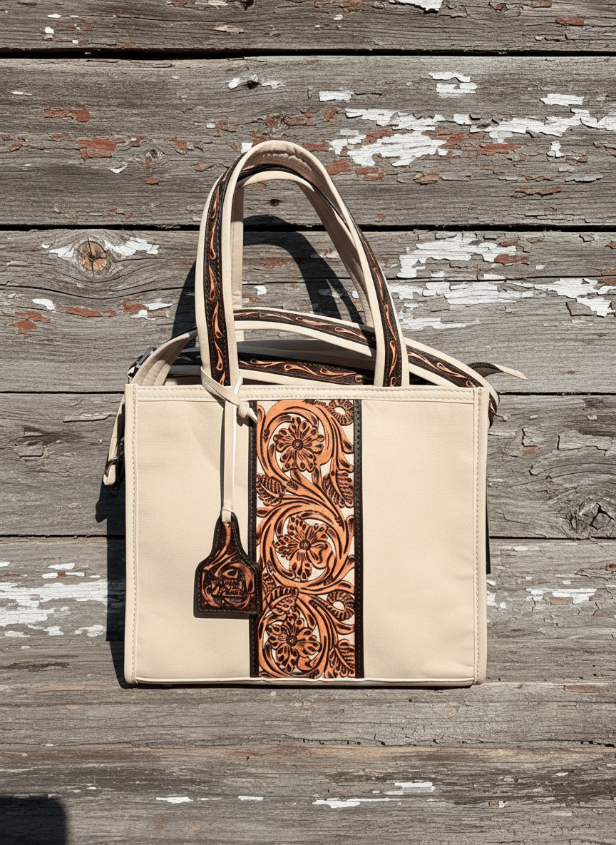 The Angel Ranch Opal Small Tote captures the beauty of Western craftsmanship in a sleek, modern design. Made from premium eggshell-colored genuine leather, this tote features intricate hand-tooled detailing that adds depth, texture, and authentic Western character. Its compact size makes it ideal for daily use while still offering plenty of room for your essentials like a phone, wallet, and keys.