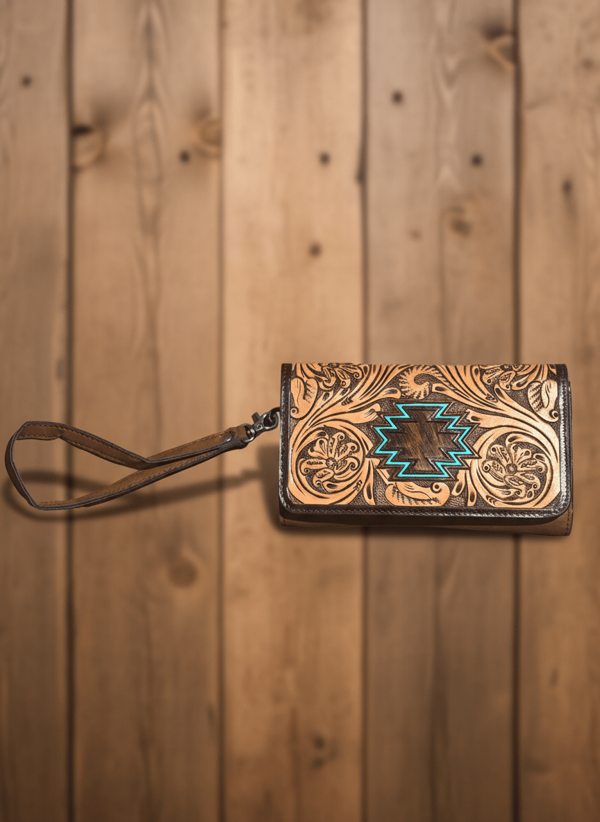 Saddle up in style with the Angel Ranch Selene Western Wallet, a stunning blend of craftsmanship, texture, and true Western flair. This women’s wallet features rich brown tooled leather, accented with genuine hair-on-hide and a bold Aztec-inspired design that makes every piece one-of-a-kind.