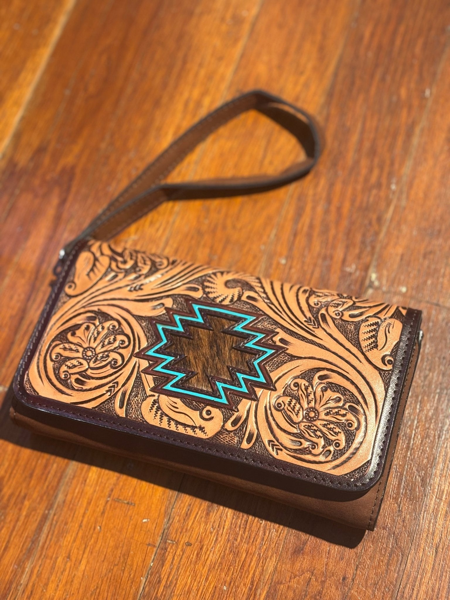 A hand-painted turquoise and brown filigree pattern adds a touch of Southwest artistry, while the hand-tooled floral leather showcases authentic detail. On the back, a convenient zipper pocket keeps coins or receipts close at hand. Inside, you’ll find multiple card slots, an ID window, a cash pocket, and a checkbook holder—perfect for keeping your essentials organized in style.