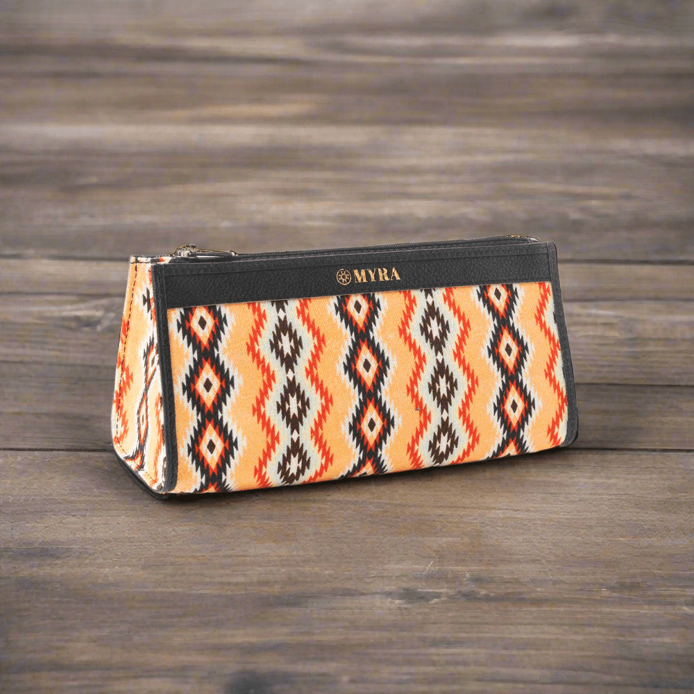 Carry your essentials with this wonderful multi-purpose pouch crafted from upcycled canvas and leather. The striking Southwestern pattern in warm honey, red, and black creates bold style. Sleek black leather trim and zip closure make organization effortless. Perfect for cosmetics or many other daily basics.