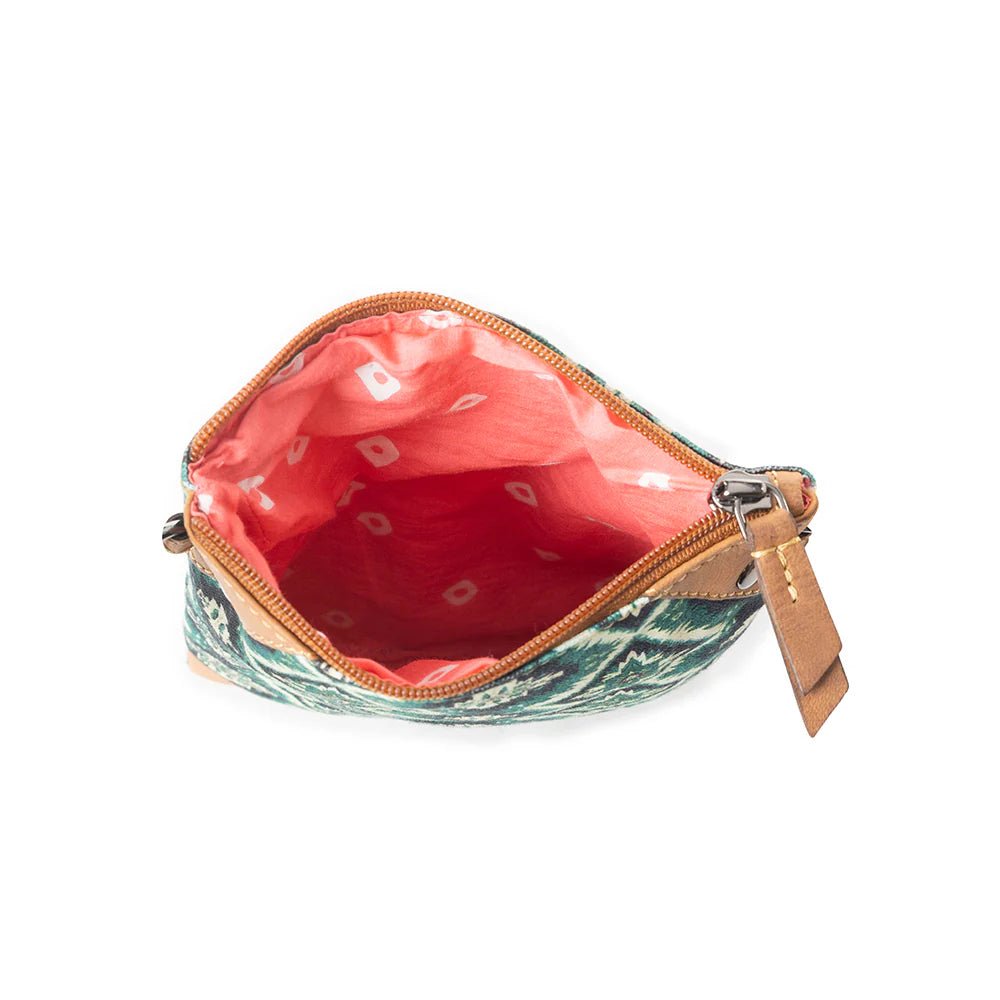 Elevate your style with our Southwest-inspired crossbody pouch, featuring a striking emerald and cream geometric pattern. Tan leather accents frame the design beautifully, while the back has a zippered pocket for convenience. Zipper-close top. Shoulder straps are in matching leather. The perfect blend of bohemian charm and practical organization!