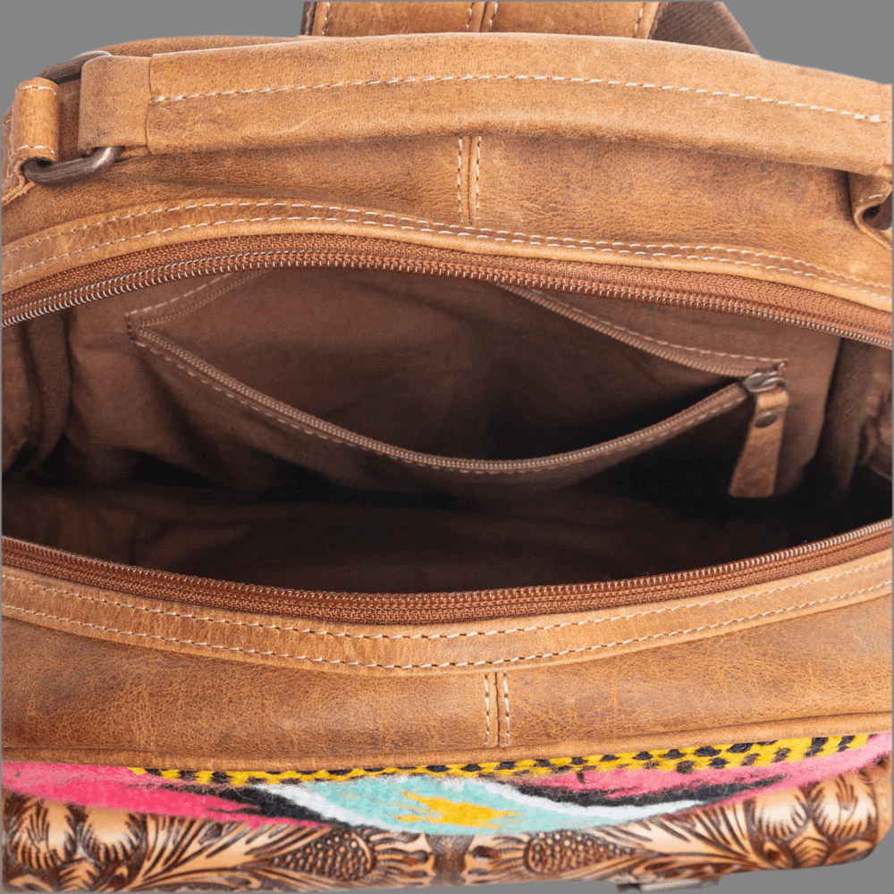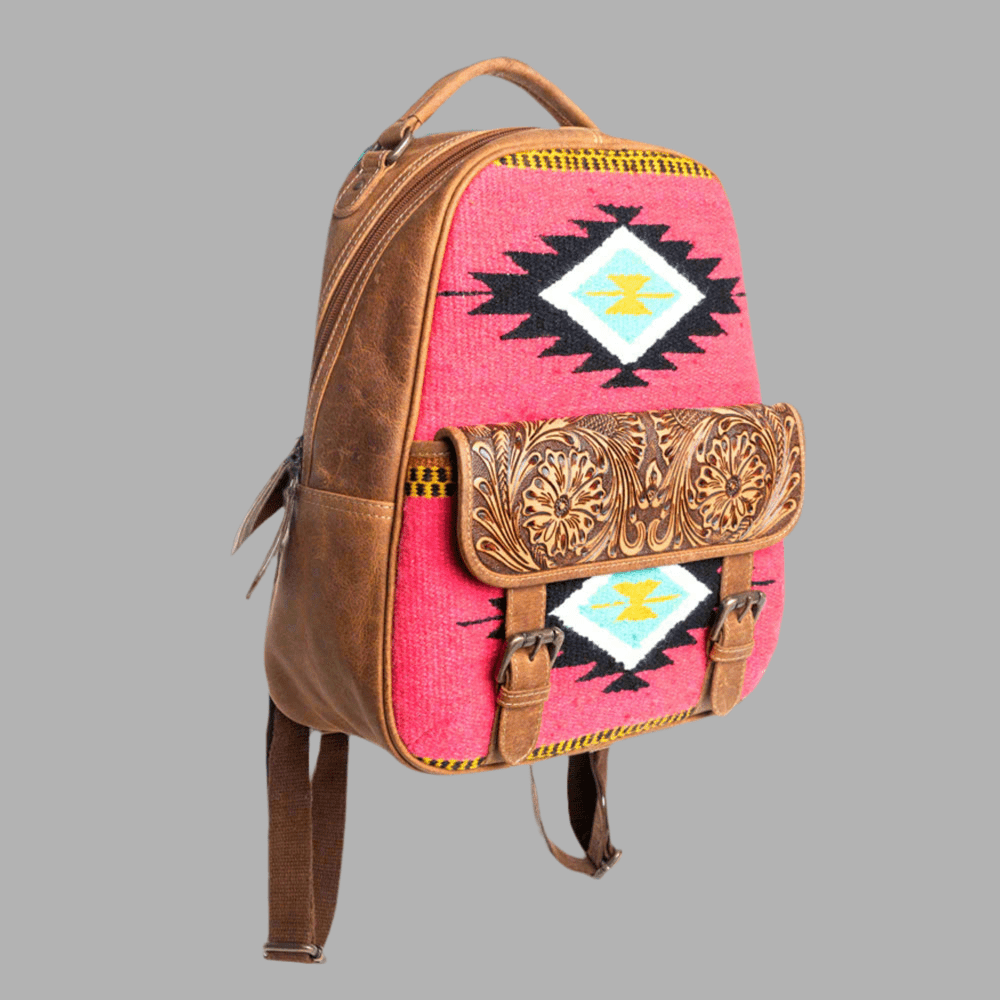 The Southwestern Rug & Leather Backpack is the perfect balance of artisanal craftsmanship and free-spirited style. Featuring a bold tribal-inspired pattern on the upcycled rug front, framed by intricate leather tooling, this backpack is a true statement piece. The back is designed for comfort with durable leather straps and breathable mesh—making it as practical as it is eye-catching. Whether you’re headed to class, the market, or a weekend festival, this backpack is the ultimate companion for the adventurous woman who values both sustainability and standout style.