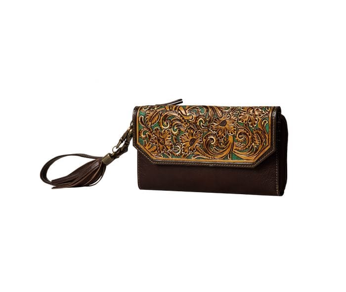 The Magnolia Morn Hand-Tooled Leather Wallet is a stunning showcase of Western artistry and functionality. Crafted in luxurious dark chocolate bourbon leather, the signature Magnolia Morn hand-tooled floral design comes alive with hues ranging from buttercup yellow to deep turquoise. The wrap-around zippered closure ensures your essentials stay secure, while the interior offers thoughtfully designed compartments, including a zippered pocket, for easy organization. Elegant, durable, and authentically Western, this wallet is a timeless accessory you’ll treasure.