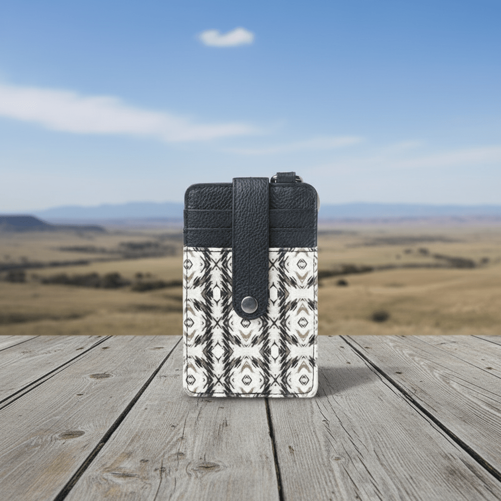 This stylish ID wallet features a Southwestern-inspired print in black diamonds on cream upcycled canvas, accented with leather trim. Complete with card slots, ID window, and key ring attachment, it's secured by a snap closure. The compact design makes it perfect for essentials while you're on the go.