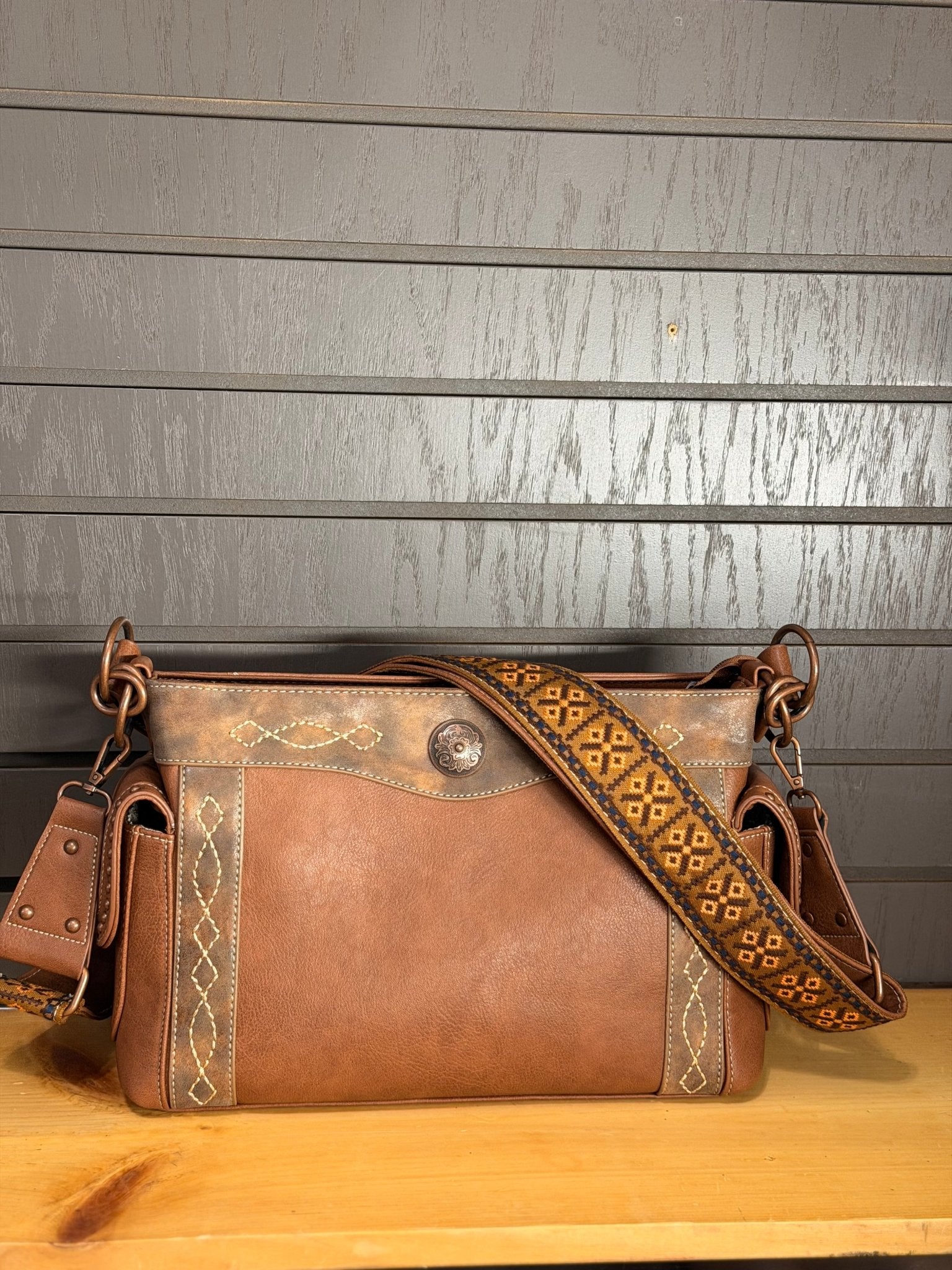 Classic Western craftsmanship meets everyday security in the Nocona Ivy Western Concealed Carry Satchel. Crafted in a rich brown finish, this satchel features decorative stitching, a copper concho accent, and studded side pockets with snap closures, adding authentic Western character while keeping the look polished and timeless.