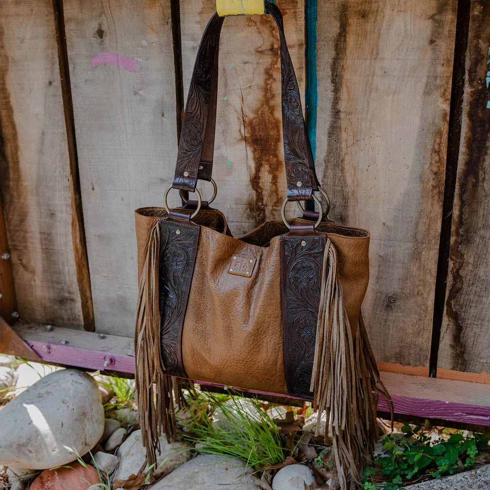 The Boho Cowgirl collection blends rustic elegance with modern flair, crafted from naturally exquisite buffalo leather. Its unique dye process retains the raw leather's original grain, enhancing it's natural beauty. This collection features soft fringe accents complemented by tooled leather details.