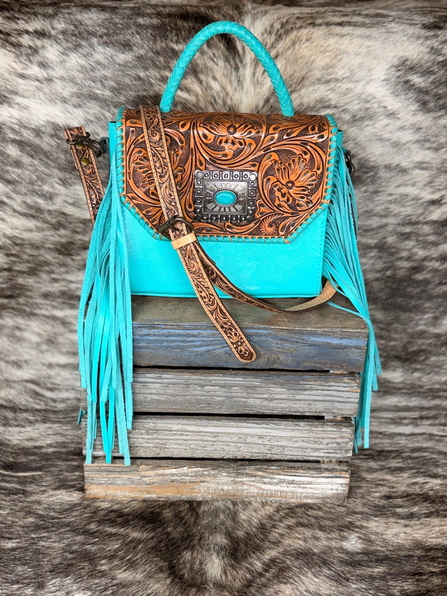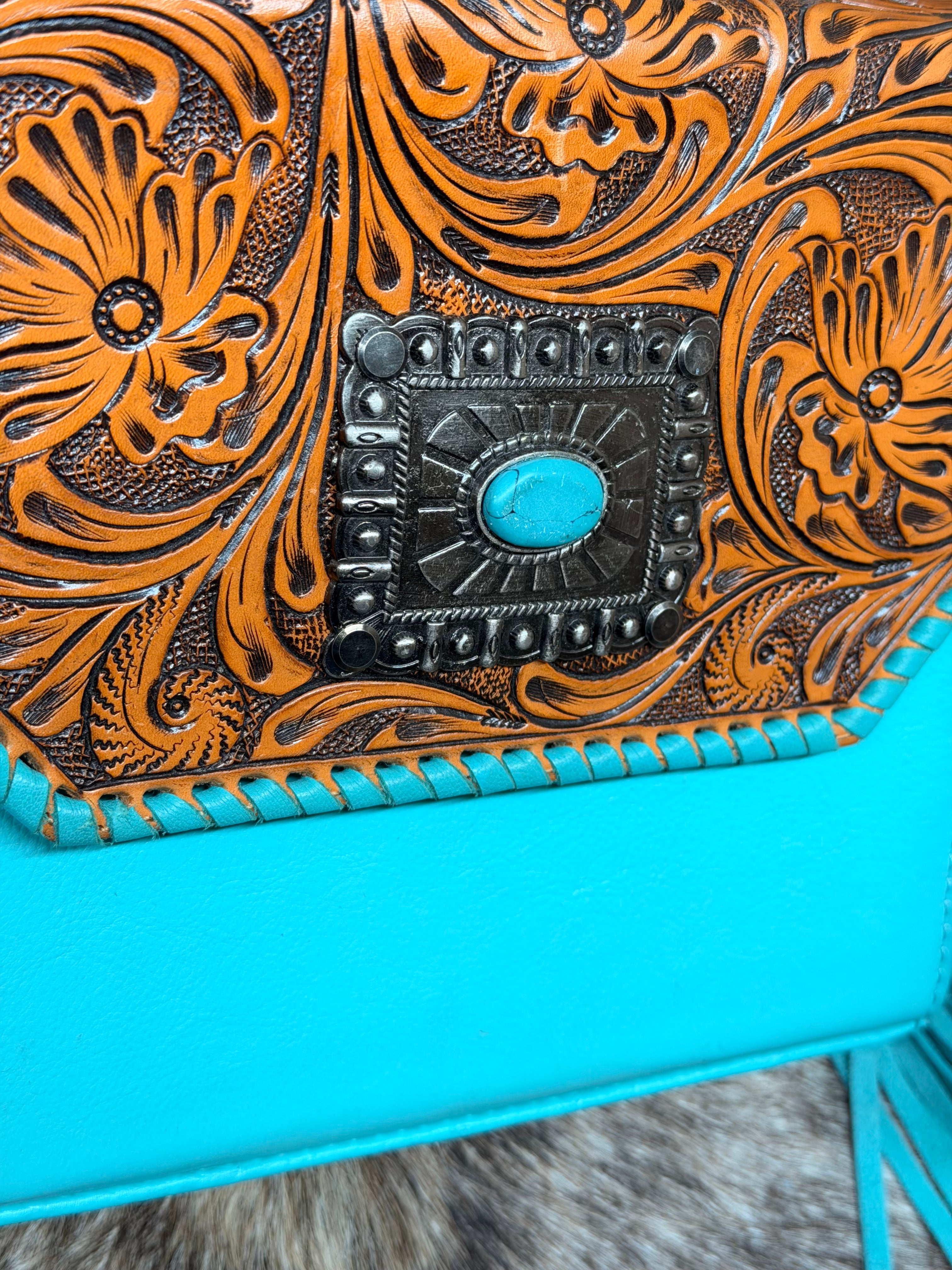 This Western Tooled Turquoise Crossbody Bag blends rugged beauty, craftsmanship, and practicality for the perfect Western accessory.