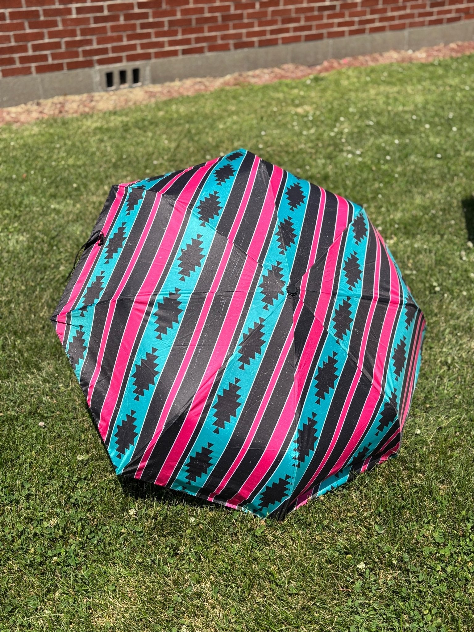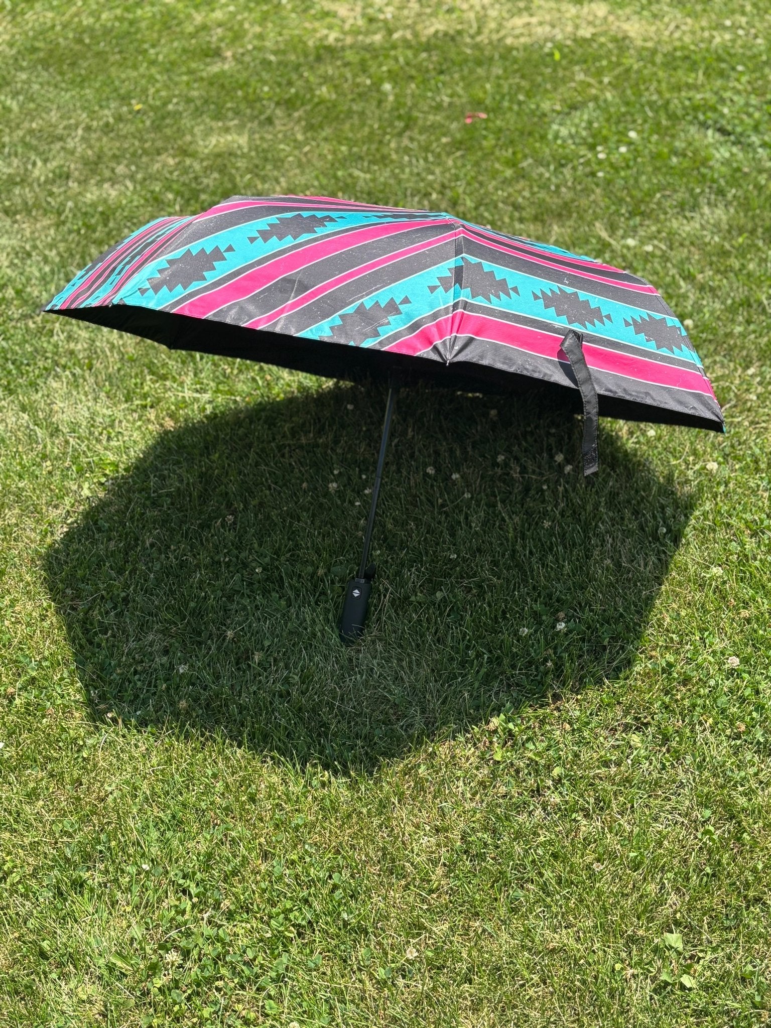 The eye-catching blue and pink tribal stripes pay tribute to the colorful, geometric designs of the 1990s Aztec trend, making it the perfect statement piece for vintage lovers and trendsetters alike. this umbrella brings a nostalgic edge to your look while keeping you dry.