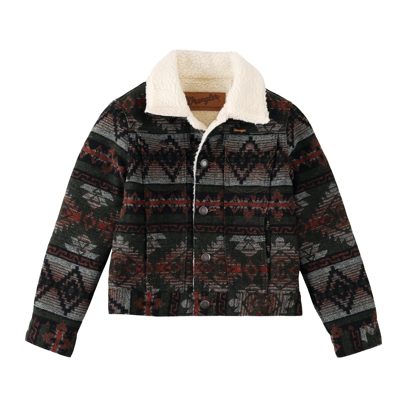 He'll stay warm in true cowboy style wearing the Boy's Wrangler® Sherpa Lined Jacquard Print Jacket. It's crafted from a hardy jacquard wool blend to help him brave the elements and lined in sherpa to keep him cozy until the dinner bell rings. Plus, he'll have two chest pockets with the "W"stitching and two hand pockets for his essentials.