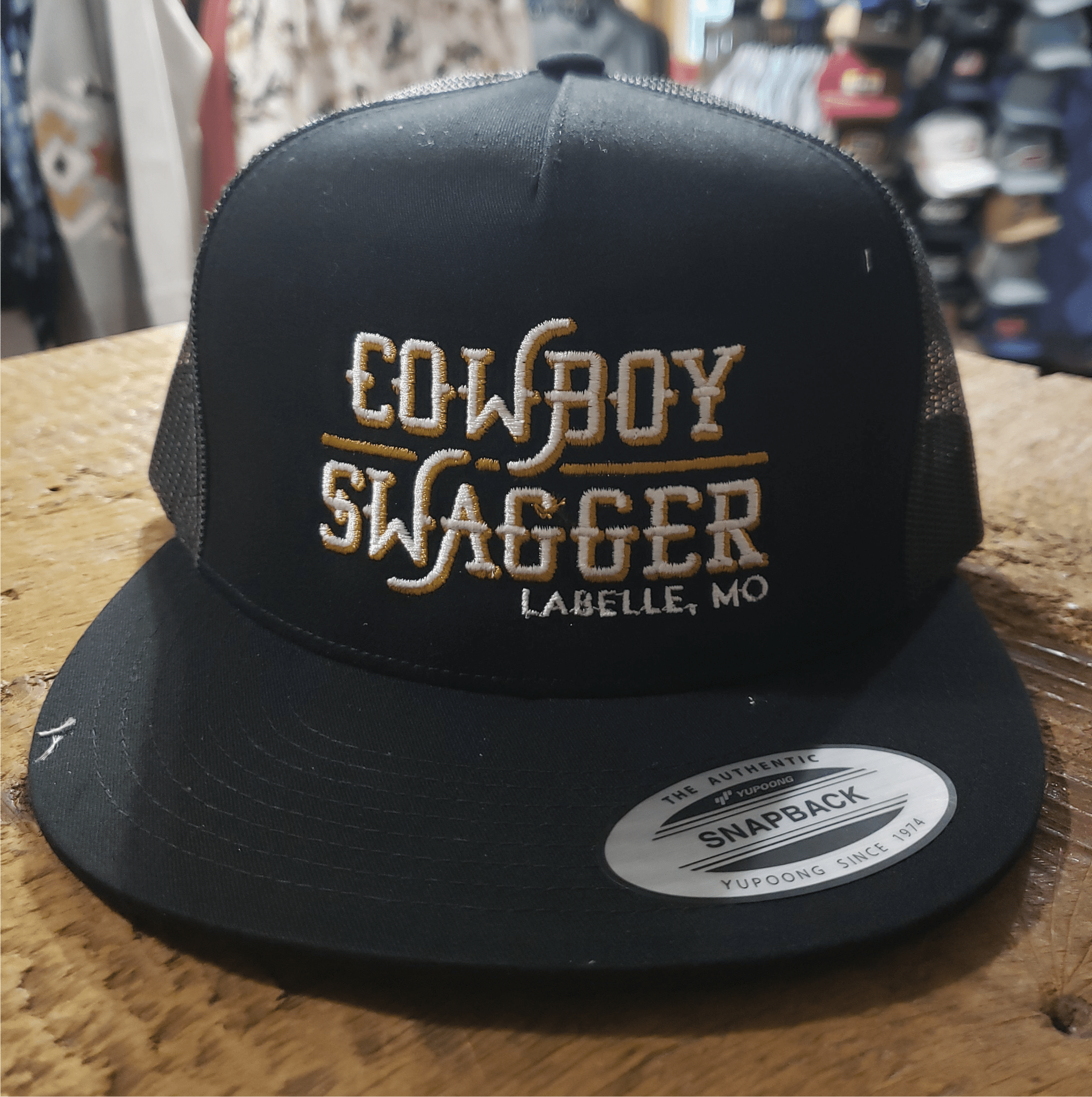 Discover the bold style of this black flat-bill snapback Western ball cap from Cowboy Swagger. Features a durable mesh back, embroidered white & gold logo, and adjustable fit—perfect for rodeos, ranch days, and casual outfits. Shop now for authentic Western swagger!